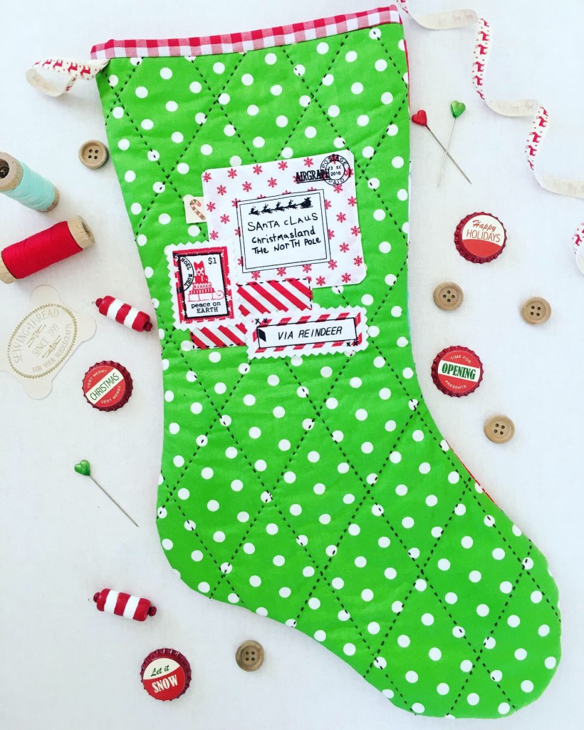 I decided to do something a little extra on the back of the stockings, besides the usual hand quilting. I added a little pocket and some postage stamps.  Fabric postage stamps are a fun way to add something a little special to your patchwork projects and if you aren’t quite sure how, I have a detailed Postage stamp tutorial for you to follow.