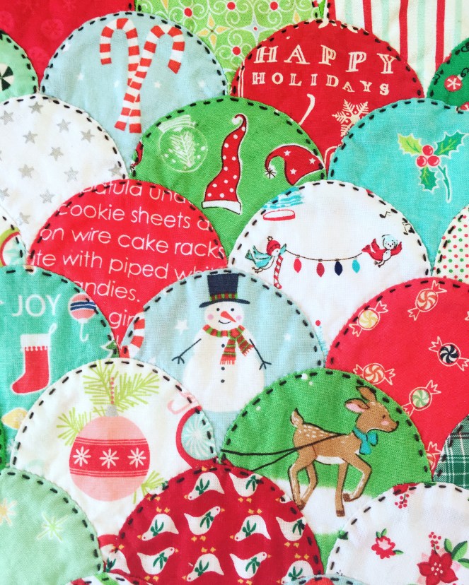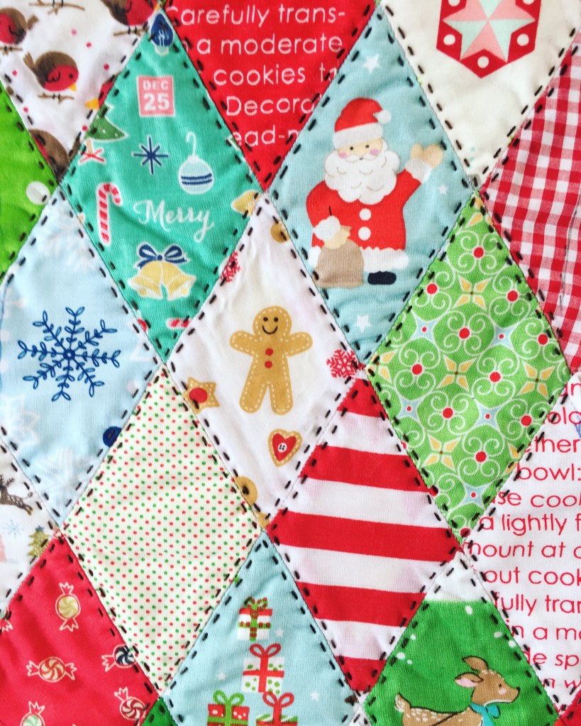 This year I made two stockings, one for each of my nieces in Perth. The first one I made using 2.5” diamond EPP shapes. I had lots of fun diving into my Christmas fabric and cutting out little characters and Christmas notions. Snow men, Santa, Candy canes and others. I then joined all of these together and hand quilted them using my favourite new shade of DMC perle No.8 dark coffee brown. I can’t get enough of this colour and the way it stiches up! It blends a little better than black but still has enough punch to stand out. So delicious! I just love the look hand quilting adds to a project.