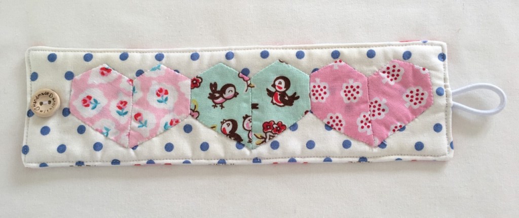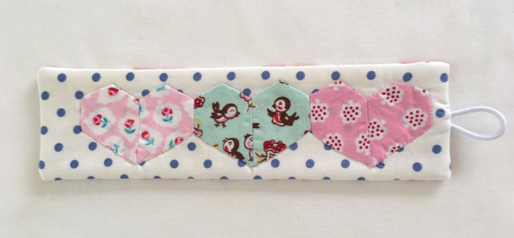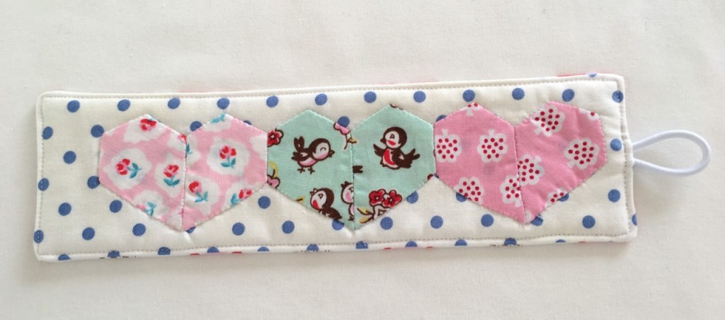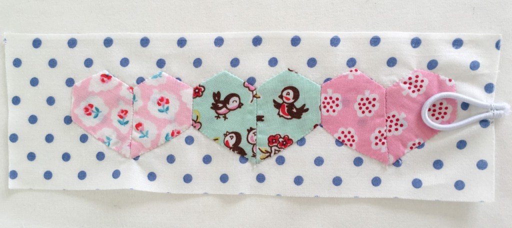 1.Using the template provided, thread baste six 1.5” jewels with chosen fabric (2 of each colour). You will need to know how to do basic English paper piecing to do this.