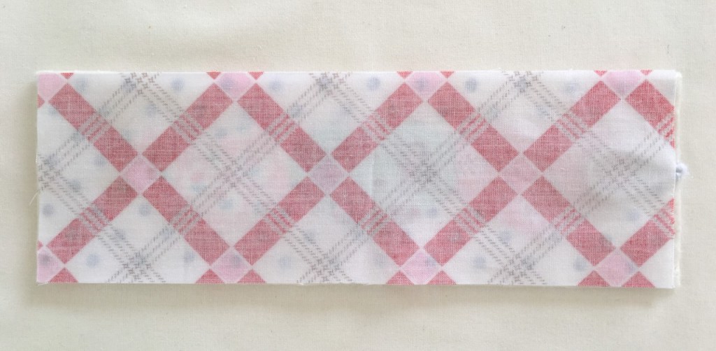 7.Take the 4” piece of elastic cord, fold it in half and baste 1/8” from the edge, in the middle of your fabric panel. NOTE: Remember to baste it on the right side of your hearts, the side with the smaller gap.