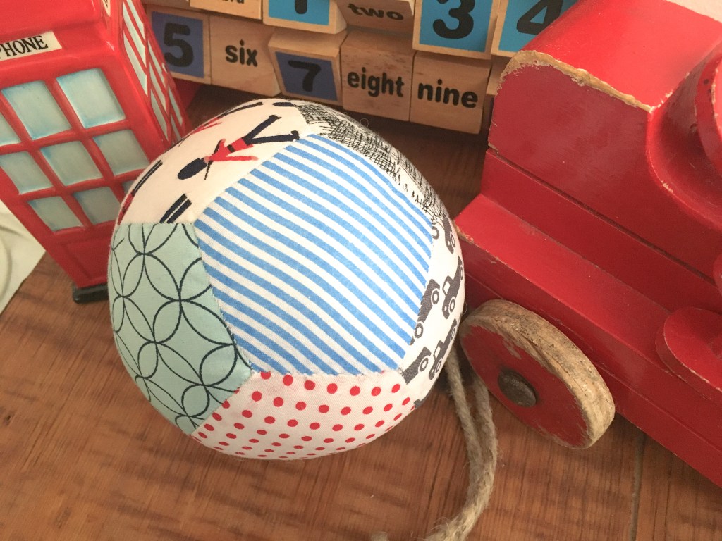 This rattle softie ball I made for him was inspired by some vintage toys in his room. The red wooden fire truck, the numerical and alphabet board and of course that super sweet red London phone booth. That chippy rustic red paint on the red fire truck is to die for. I didn’t realise it at the time, but I sure do love the traditional reds and blues for a boy. Here’s one more picture from the top because it all looks so sweet together.