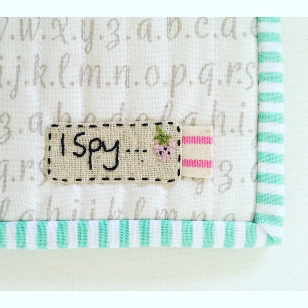 I felt like this mini needed a special ‘I spy’ label, so I made a linen patch (Amy Sinibaldi’s speciality) and stitched a tiny little strawberry next to the ‘I Spy’, because who doesn’t love strawberries. I just love the way linen contrasts with fabric.