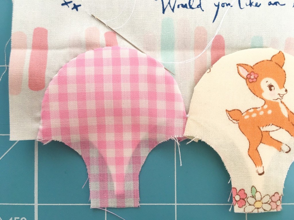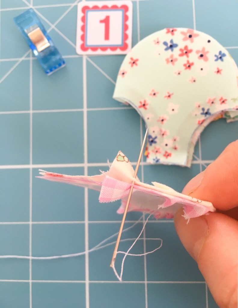 You are then going to join them at the points with a few stitches (about 3) over the top of each other, by put putting the needle into the fabric between the fabric and paper right at the very point of the curve. You don’t need to worry about tying a knot in your thread when you finish, as these are just stay stitches to hold your clamshells in place.