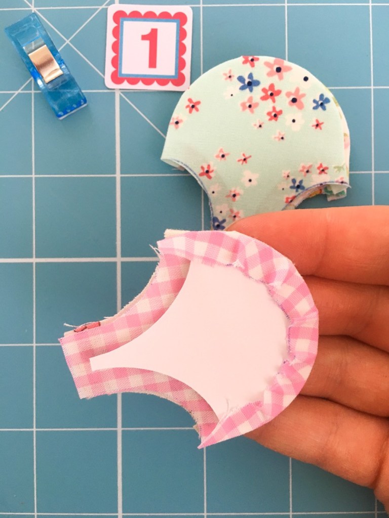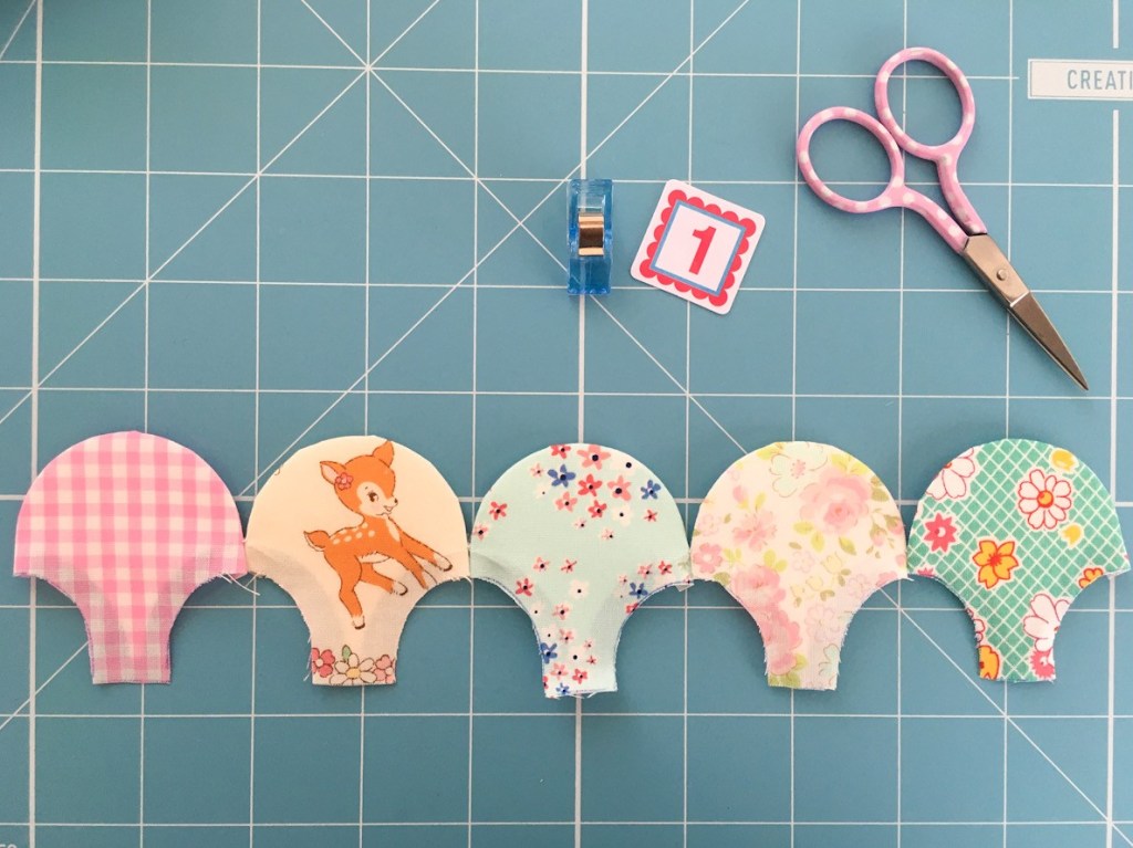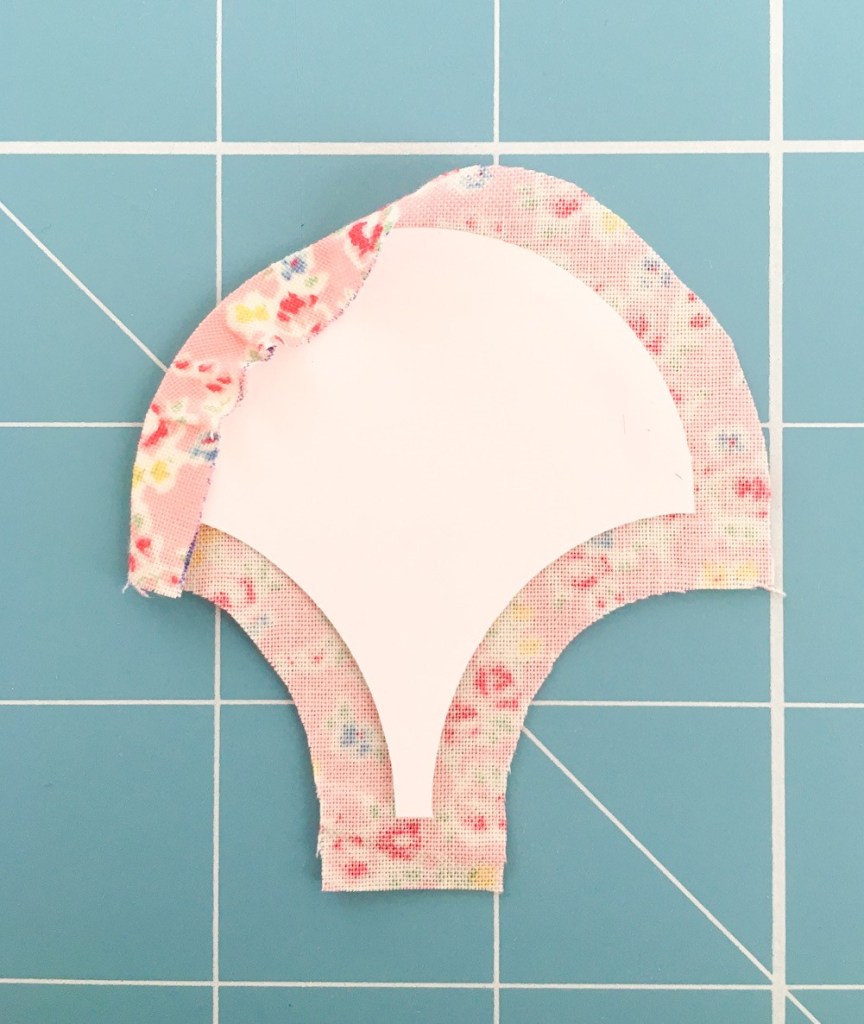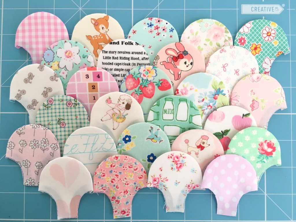 First up you need to cut out and baste all your clamshells for your project. How many you have and the layout of these will depend on what you are making. As a general rule, I lay mine over my template in rows and use that as a guide. Remembering to leave enough overhang for seam allowances.
