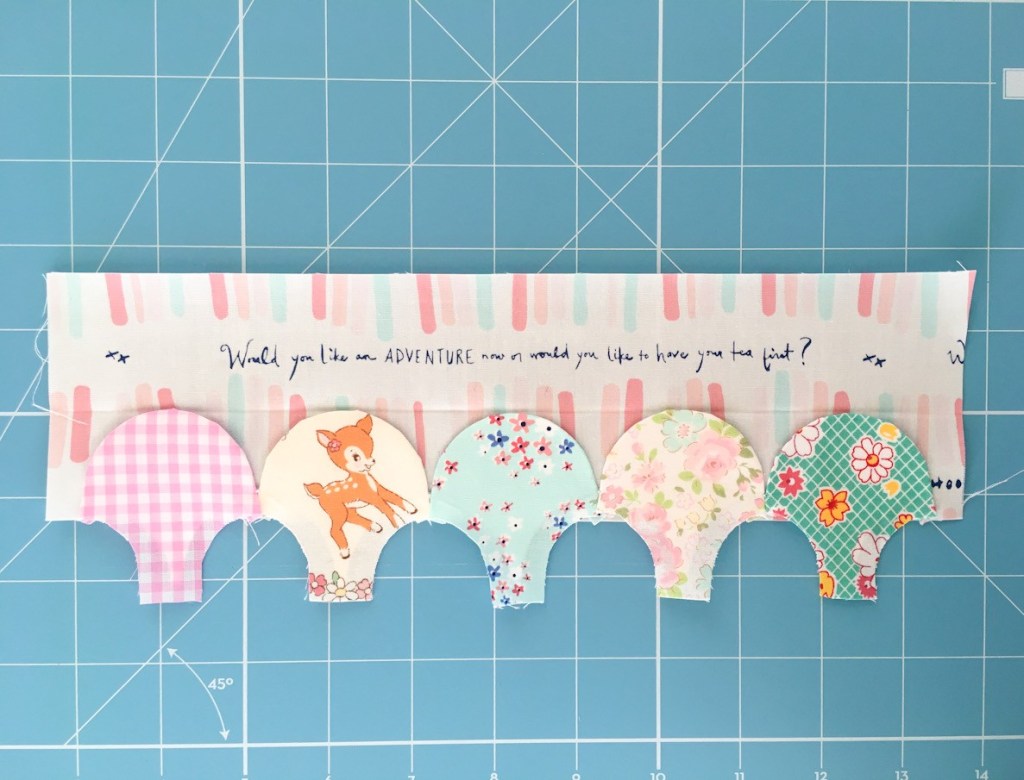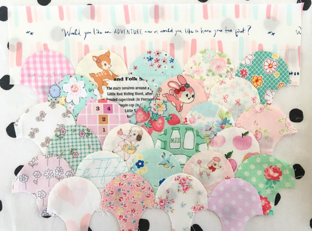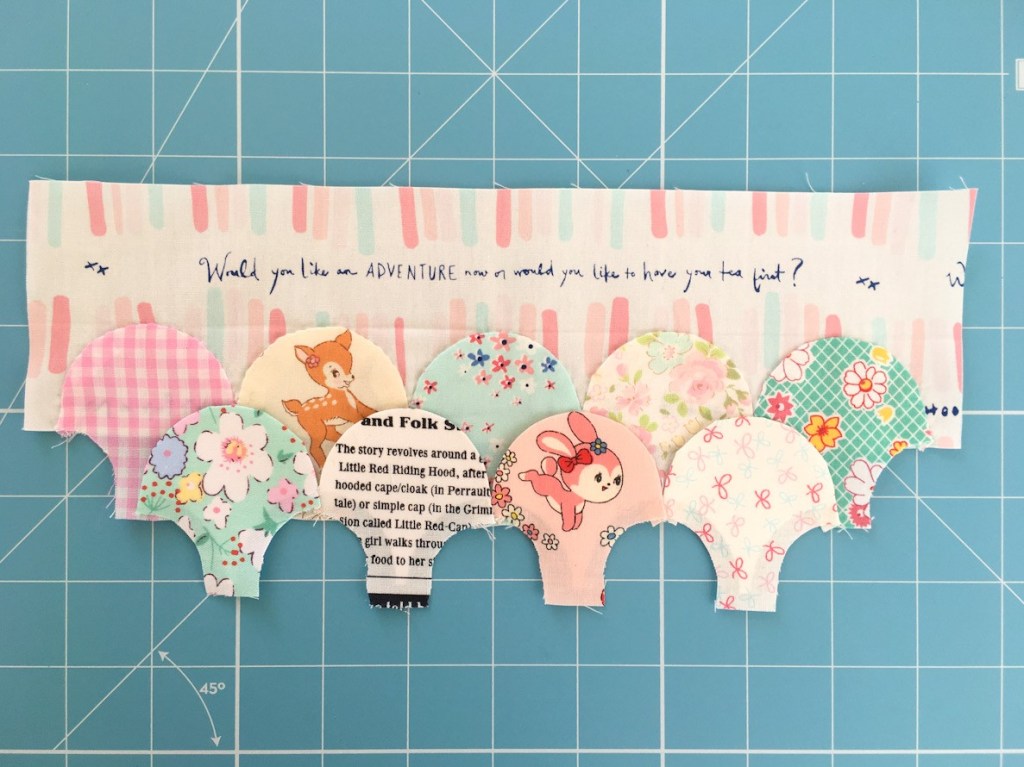 Now your clamshells are ready to be sewn down to your foundation fabric. You do this by using an appliqué stitch and sew along the top of the curve of each of your clamshells.