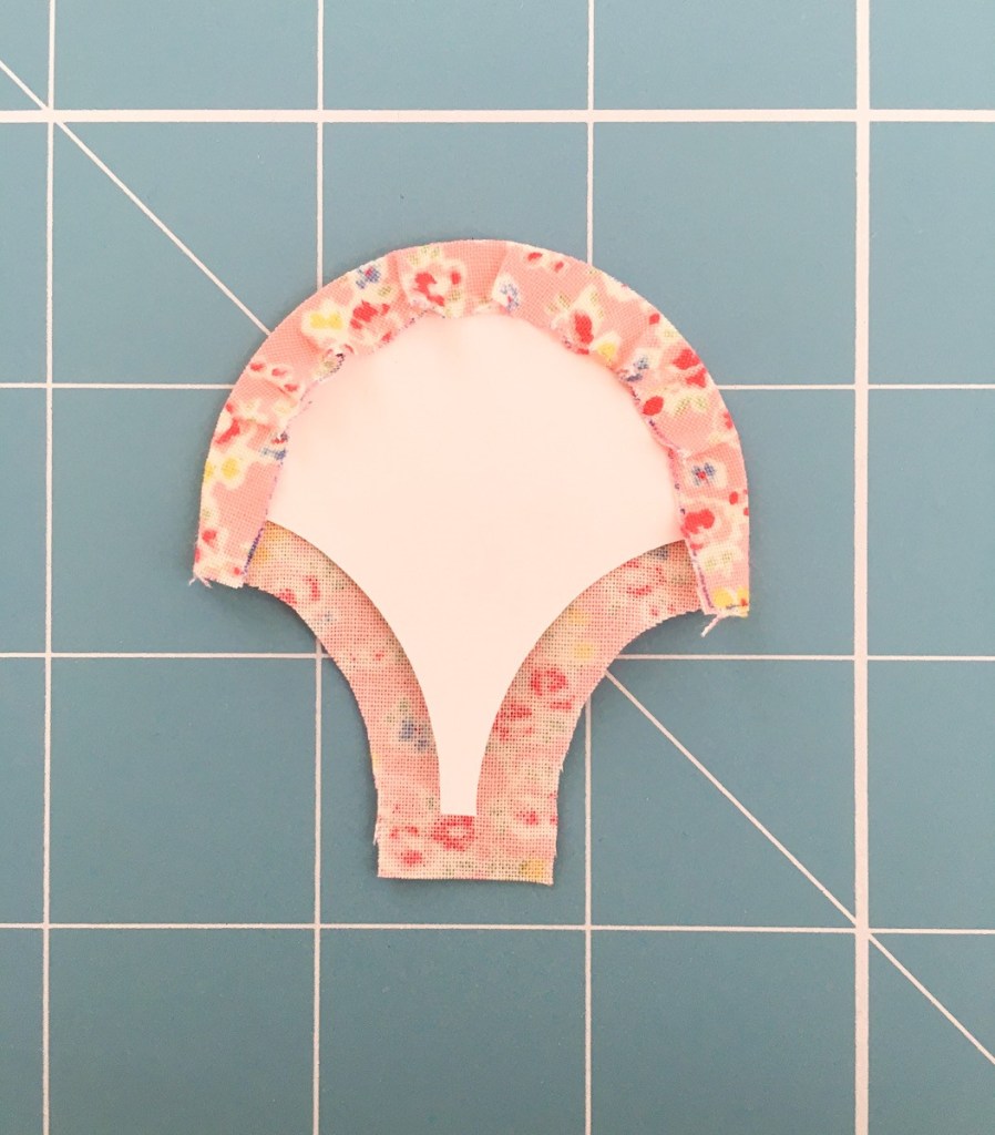 Put a line of glue around the top curved edge, right from one point to the next. Then press your fabric around the curve about a 1/3 of the way. Then I go to the other side and work my way back from there.