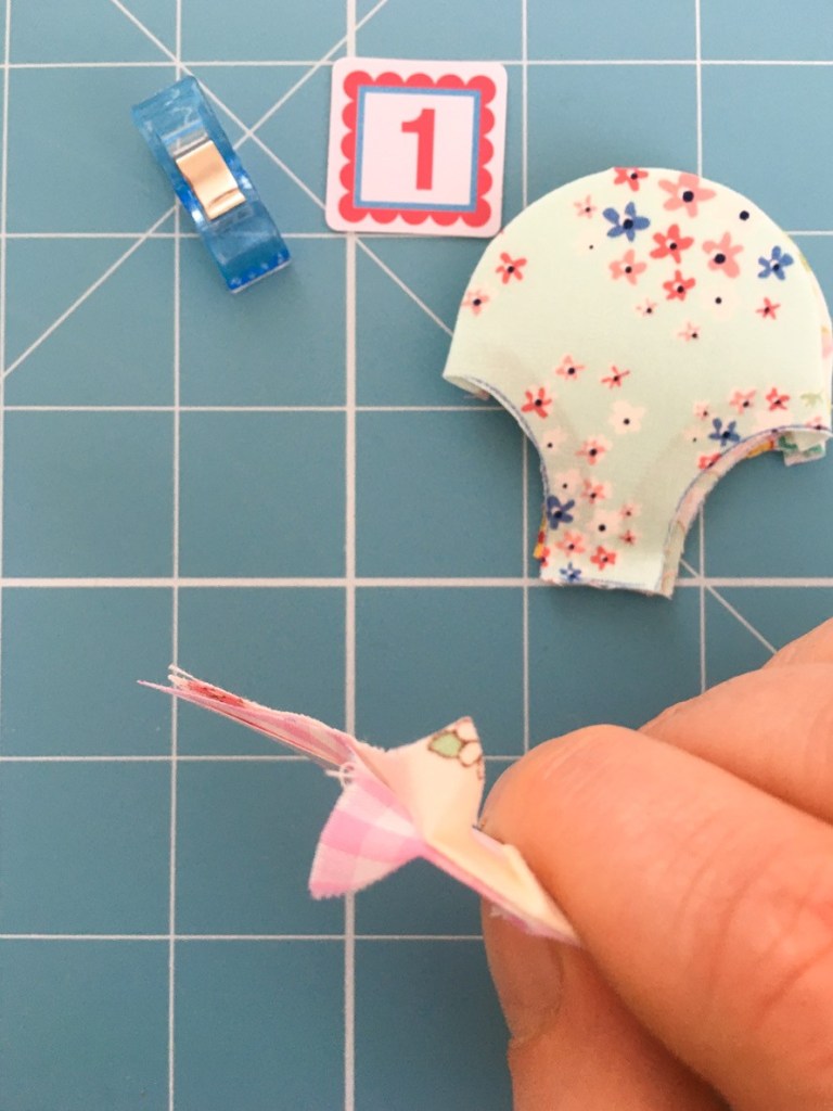 Then lay your clamshells down to line up along the fold line of your foundation fabric. I like to then press the clamshells with a hot iron to make the glue dry quicker.