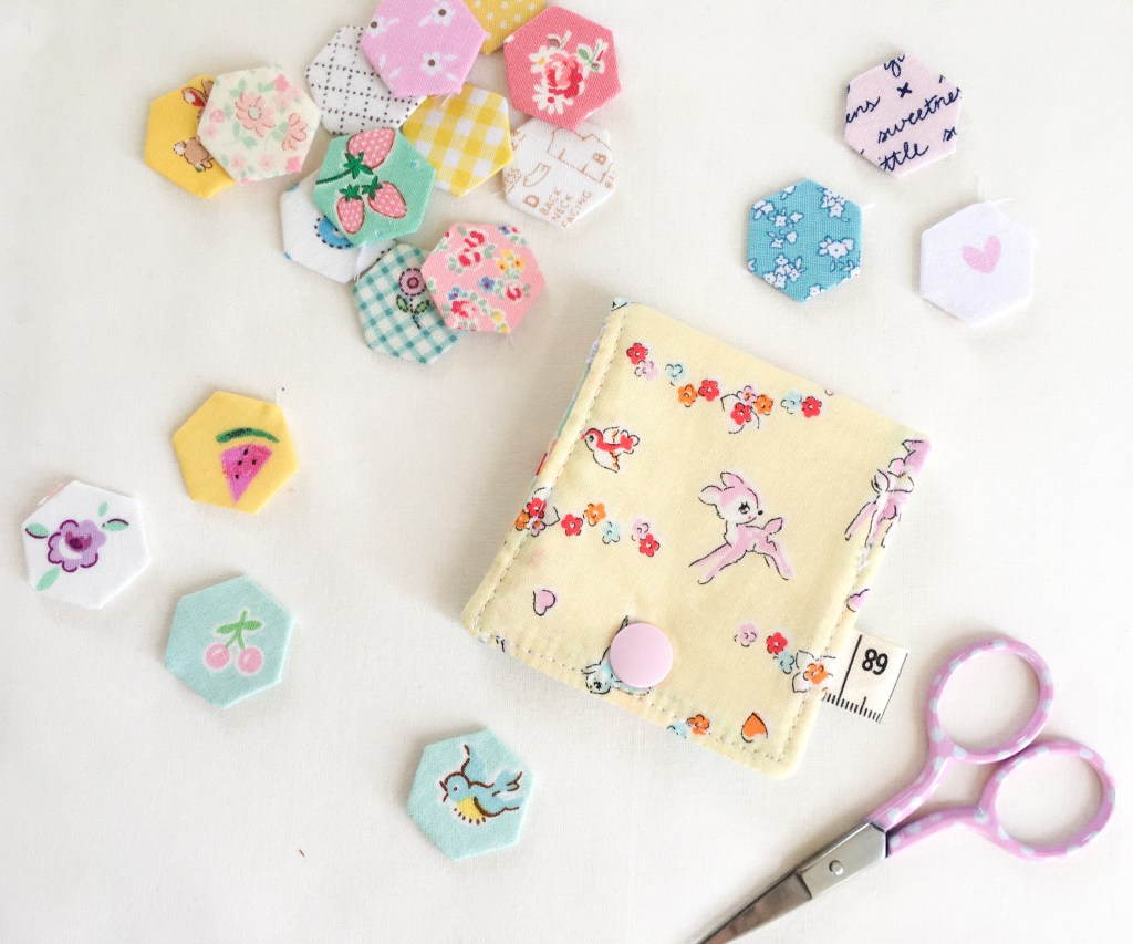 Starting with my newest pattern the ‘Itty Bitty Needlebook’. This little pattern came to me as I needed a very small needlebook that was slim line and didn’t take up too much space. I wanted it to be able to easily fit into my small sewing case and fit into my small EPP sewing tin without taking up much space. It only needed to hold a few needles and so the Itty Bitty Needlebook was born. It’s only a whopping 2 ¾” wide buy 3” high when closed, and of course I had to cram as much cuteness into that small size that would allow.