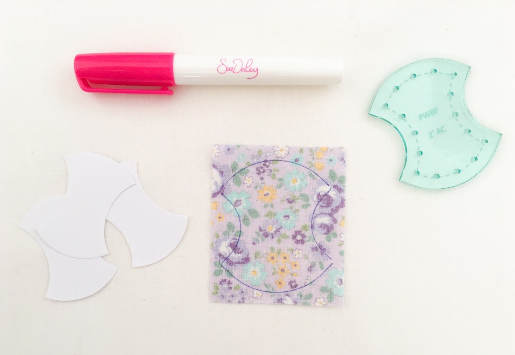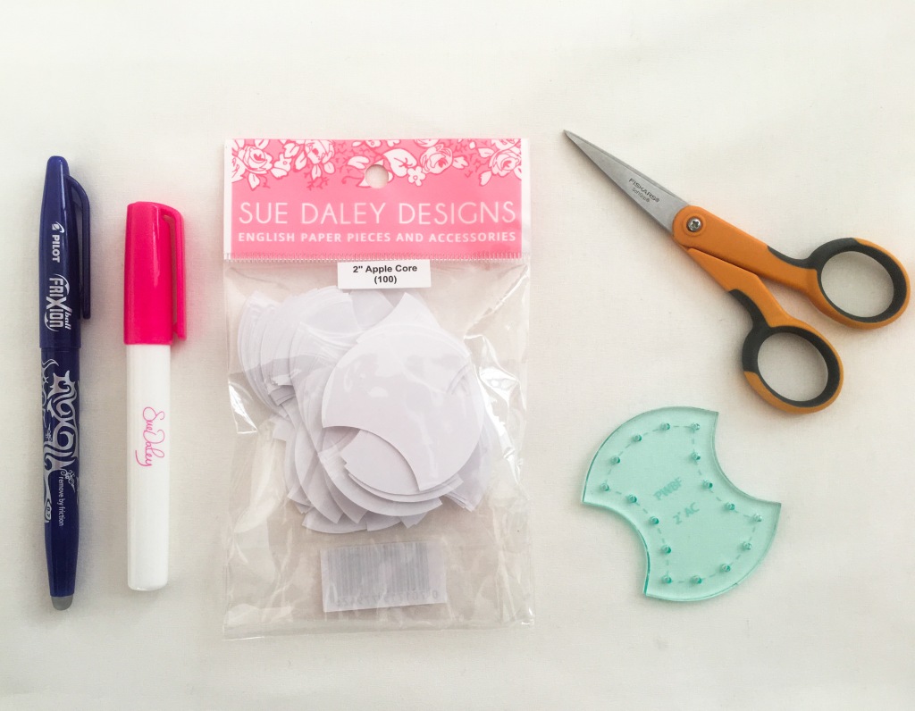 I use a few EPP Staples to sew my apple cores with. Pre-cut papers and a matching template, and a sew line/Sue Daley glue pen for basting. For curved shapes, I can’t recommend pre-cut papers enough. They are laser cut with precision. Something we can’t achieve by cutting the shapes out ourselves, and when it comes to curves the secret to sewing the perfect shapes is all in the preparation.