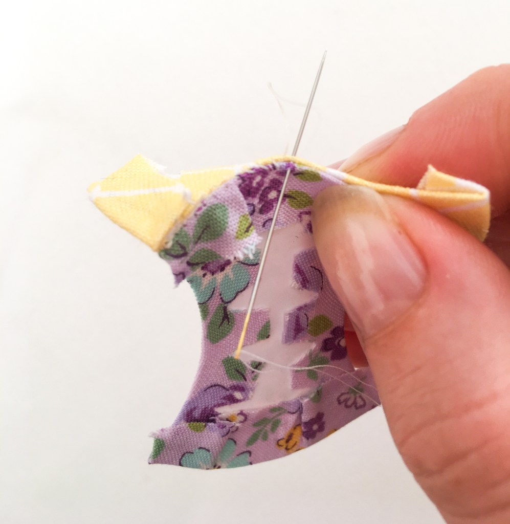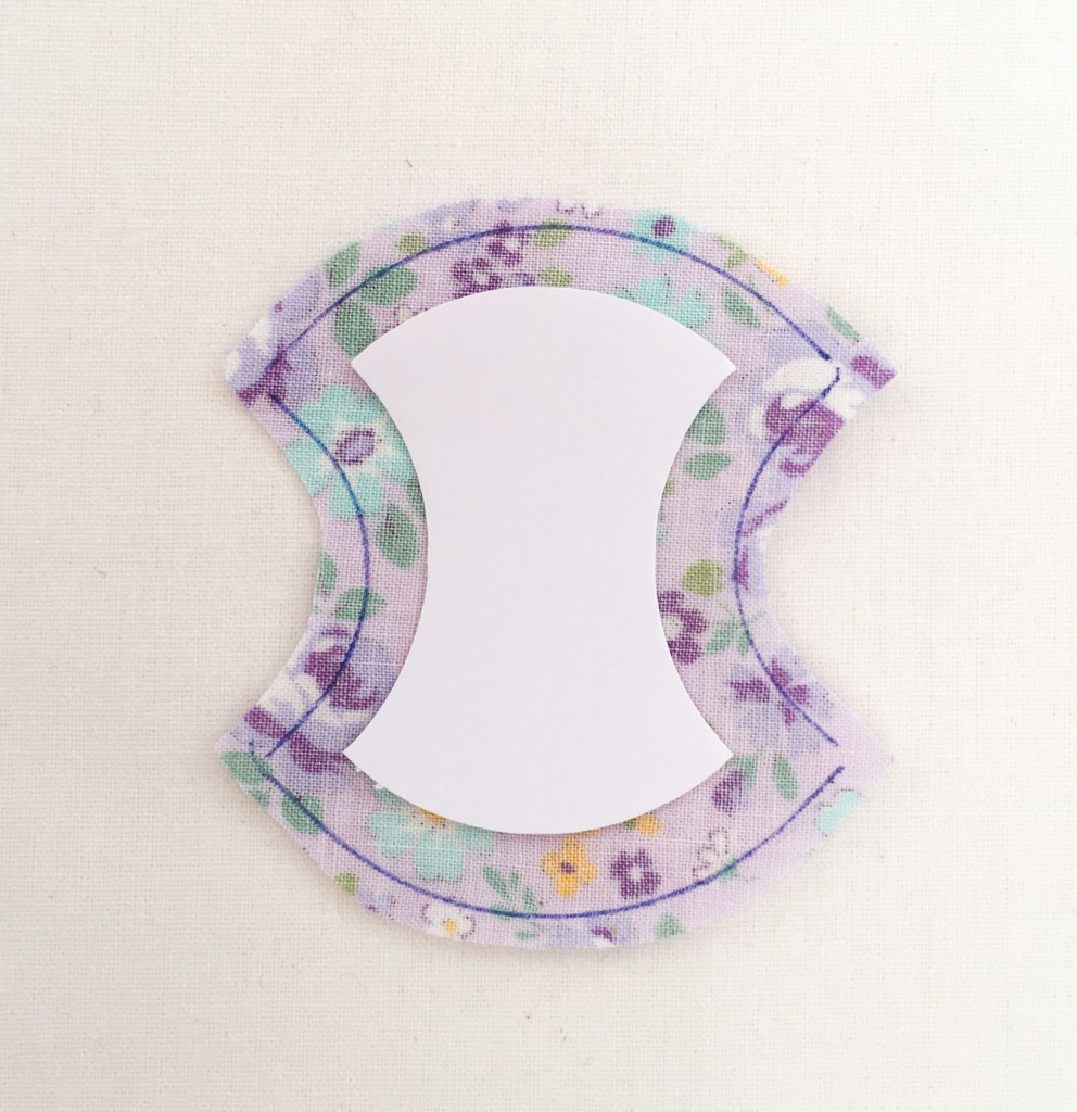 As I mentioned in my clamshell tutorial, you will also need: a small pair of sharp scissors, an iron, a pressing mat/ironing board, and of course fabric and a needle and thread. I’m a huge fan of Sue Daley EPP products, I also use her size 11 milliners’ needles. They are very fine and make sewing EPP shapes so much easier. My thread of choice is bottom line thread. It’s very thin but very strong and disappears well into the fabric.