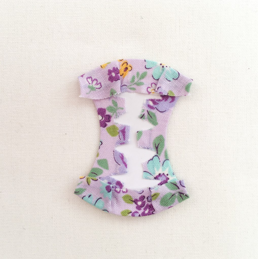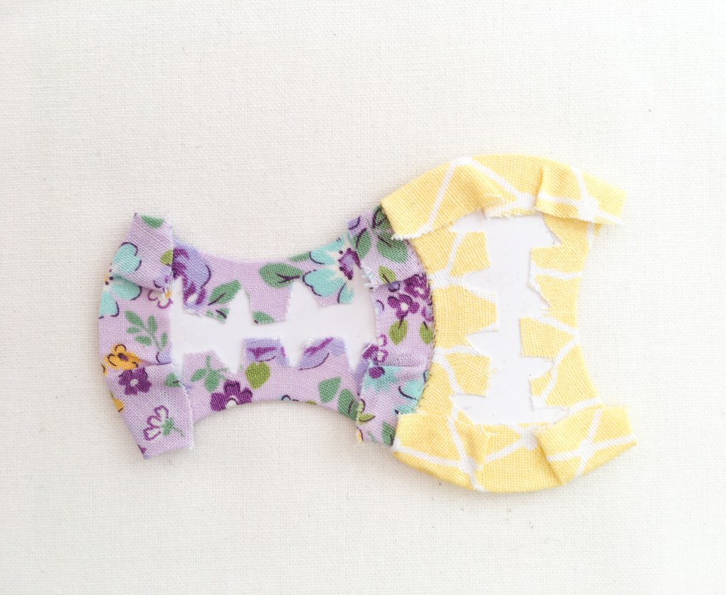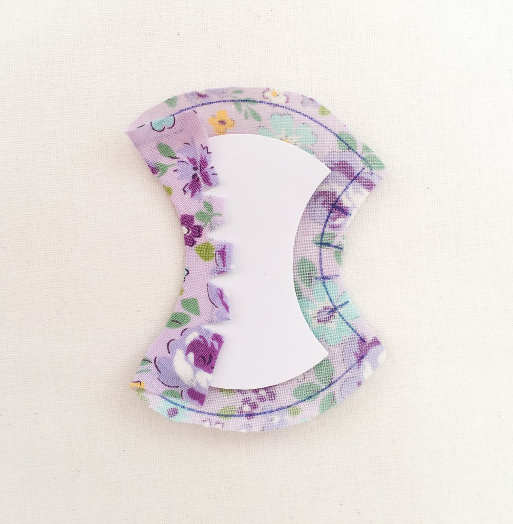 Swipe your glue pen along the first inner curve. Starting at the middle and working your way out, push the fabric firmly along the first curve. You may find you will have to use a bit more glue than you normally would for straight edge shapes. You need everything to stick down well and securely.