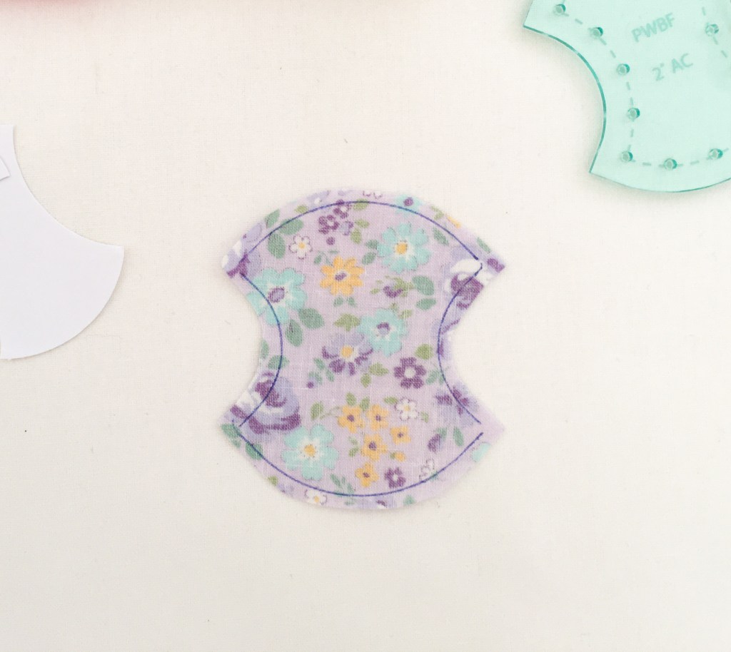 Now BEFORE you cut anything, I like to use a⅜” seam allowance for my apple cores. It makes the basting process much easier. The acrylic templates that are provided with EPP papers have a standard ¼” seam allowance. So, you will need to cut an EXTRA ⅛” OUT from the line you just drew using your template. If you don’t want to use a template, simply place a paper down and cut ⅜” from the edge of the paper. I still find using the template much easier though.