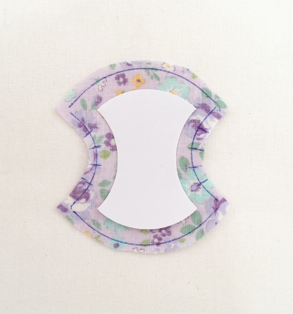 To baste the outer curves, swipe your glue along one outer edge all the way from one point to the next. Starting in the middle press your fabric around the curve. Pushing down firmly as you go all the way to the corner. Then come back and finish the rest of the edge.