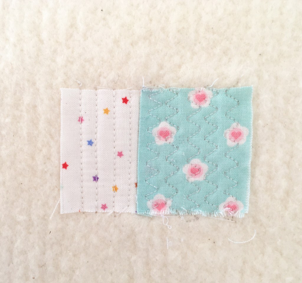 2. Place your first scrap somewhere in the middle of the batting and quilt it down. You can use basic lines, try free motion, or even experiment with the different decorative stitches on your machine. I use a Janome DC2050 and I love stitches 20, 34 and 41.