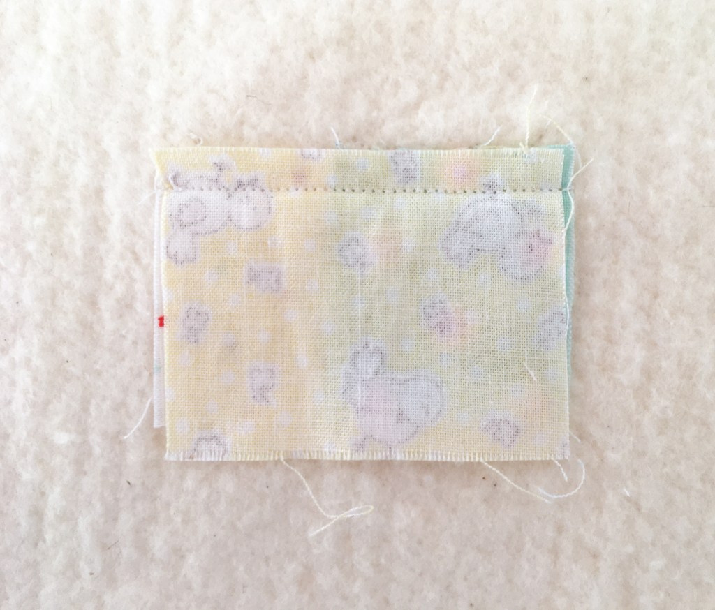 3. Choose your second fabric and place along one side of your first piece, right sides together. It can be whichever side you like but it’s important that they are roughly the same length. Stitch down using a ¼” seam allowance.