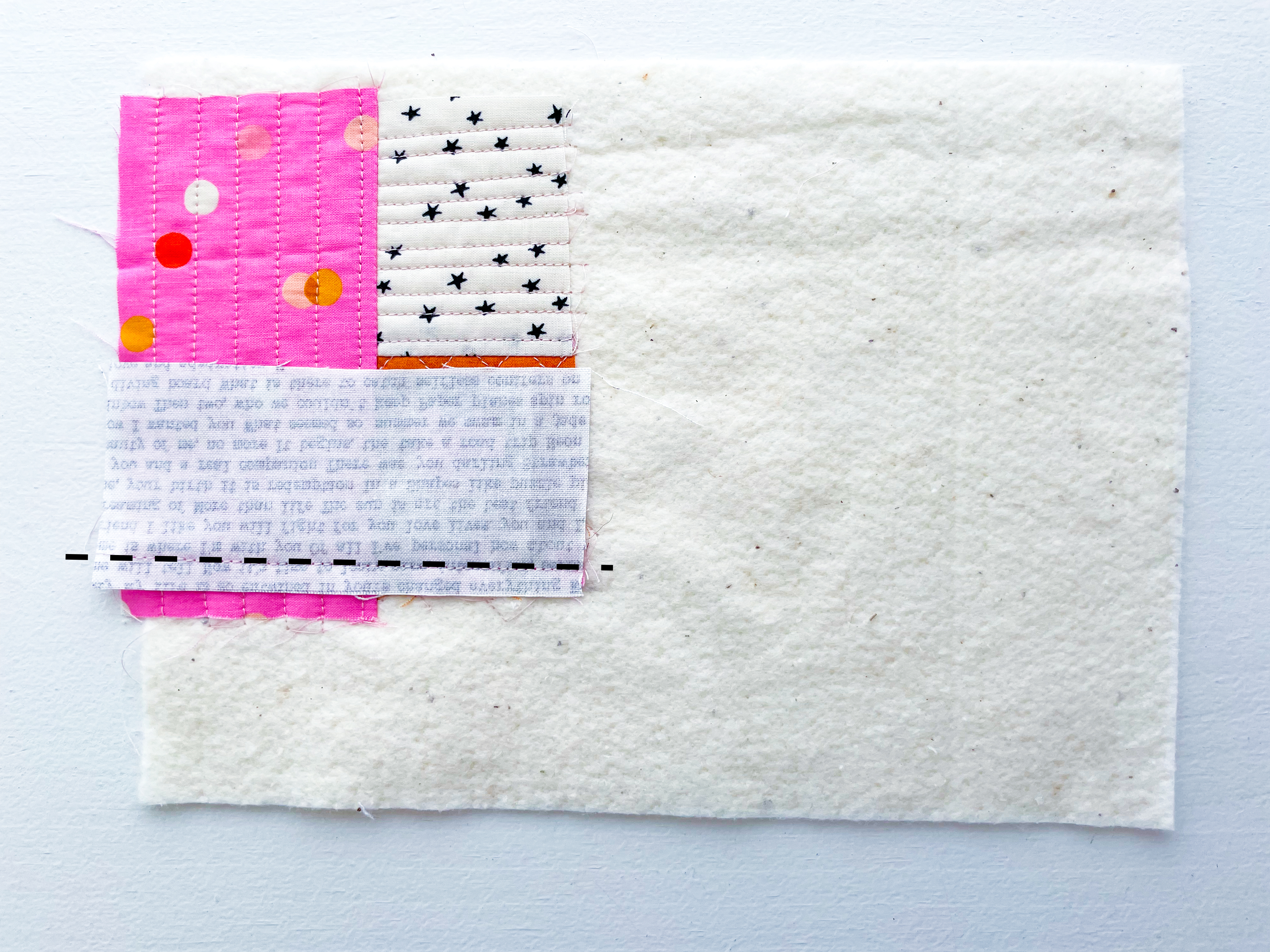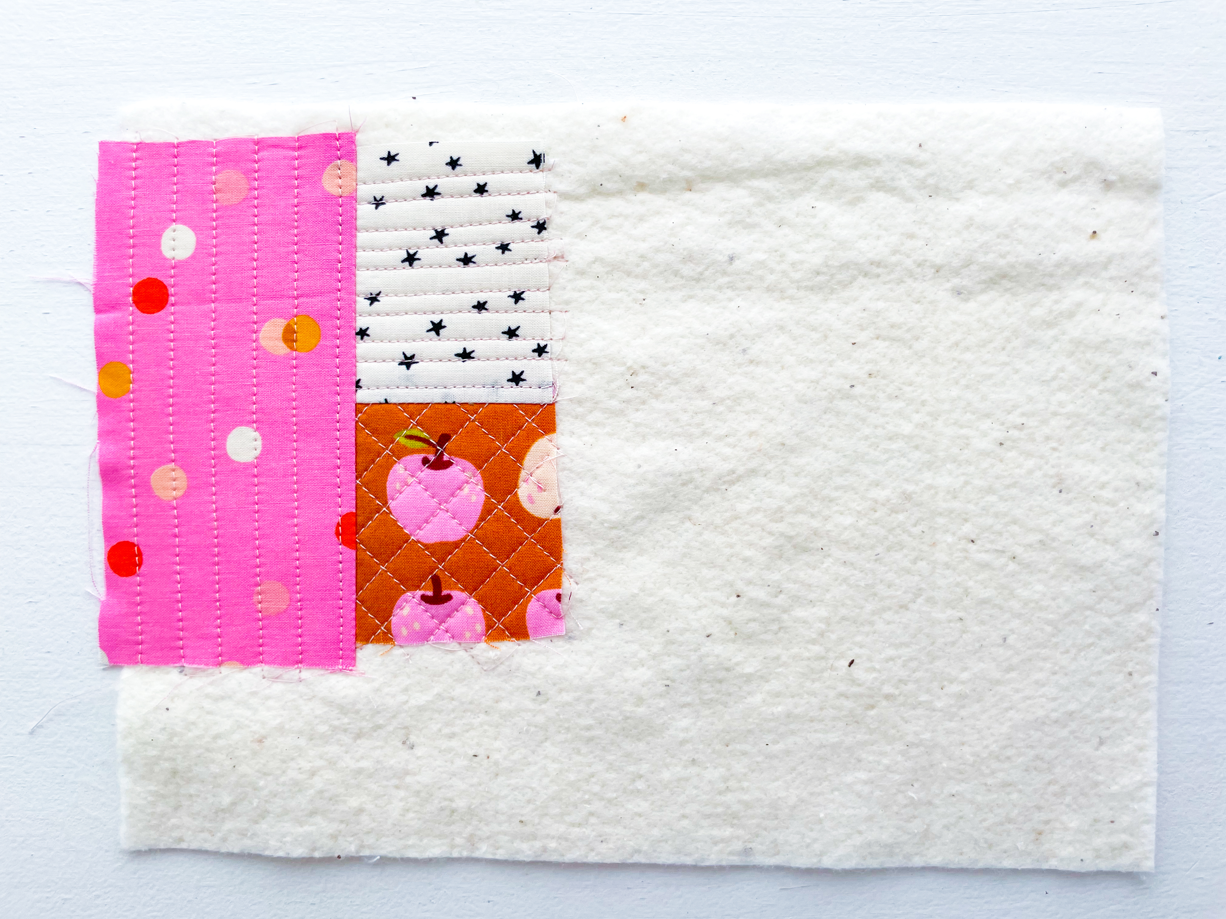 If using a quilt block, keep it small and simple — around 2–2½″ blocks work well. Think of something like a tiny economy block or sawtooth star. This will form the centre of your quilt-as-you-go panel. Plus, if you’re looking for some FREE economy block templates, i’ve got you covered in my Economy Blocks Made Easy Guide.