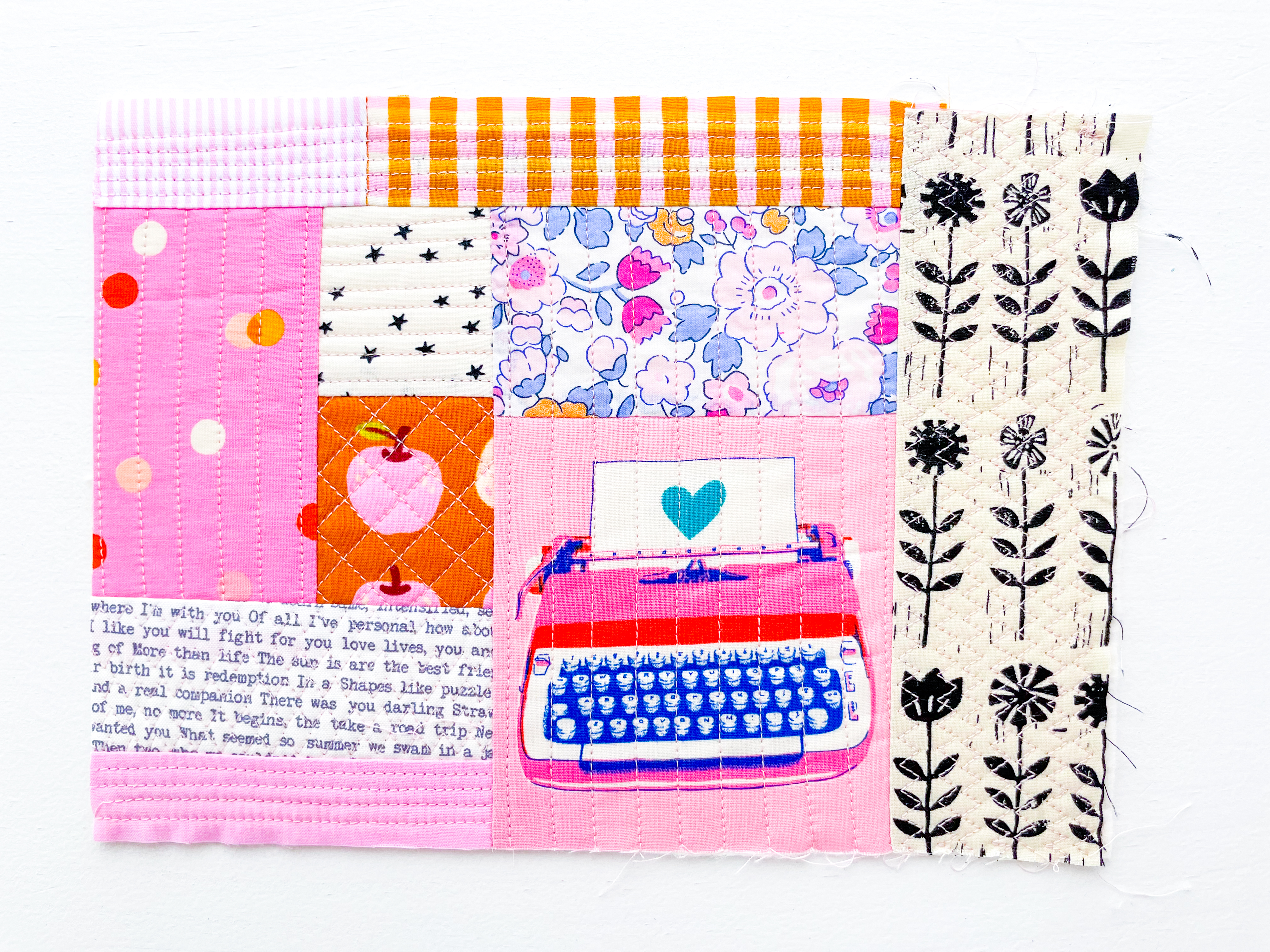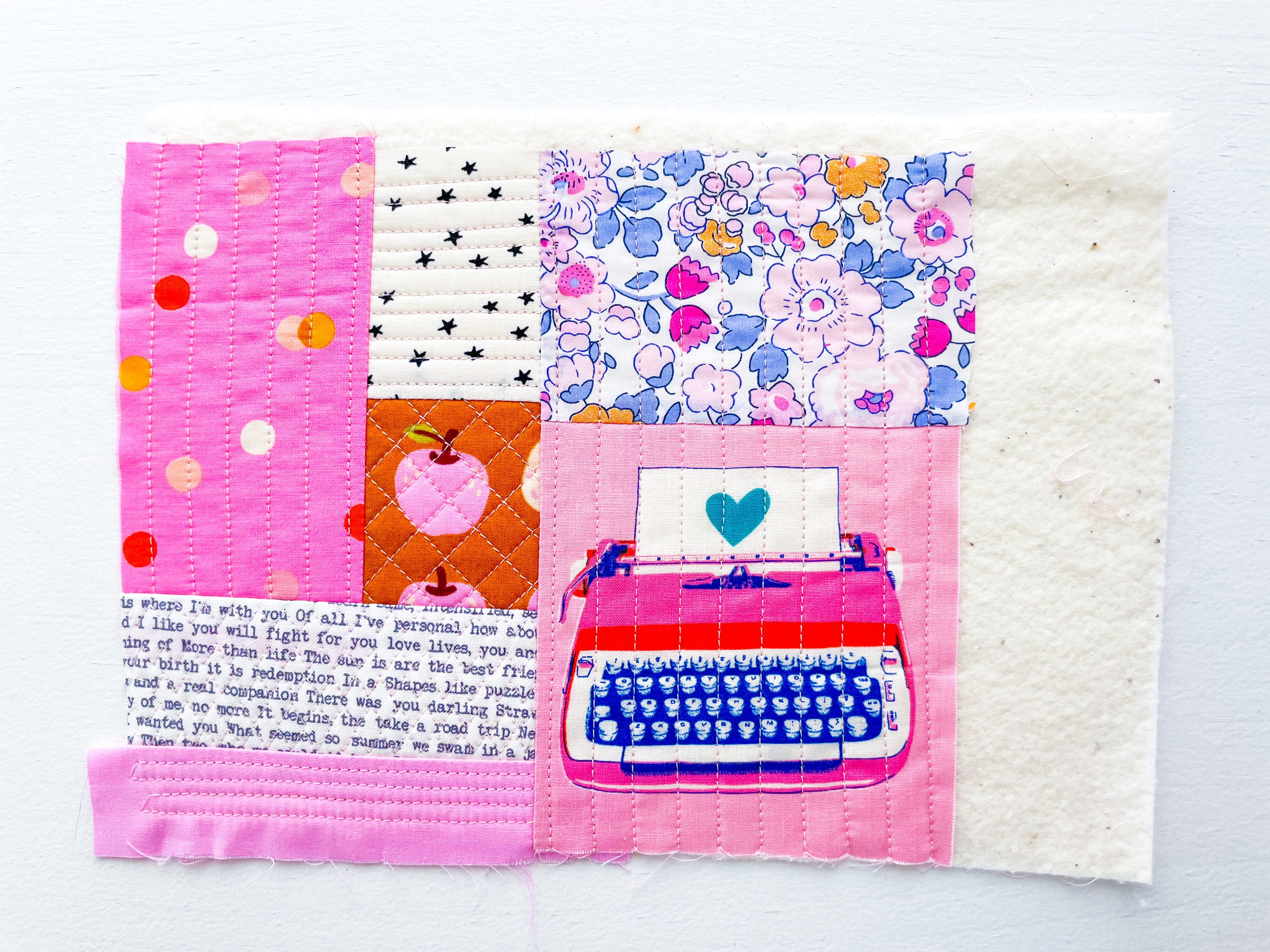 This is exactly what I did with the RSS Typewriter print and the Liberty Betsy print in my panel. Simply sew the small print to a coordinating piece, the panel, press, and quilt it just like any other scrap.