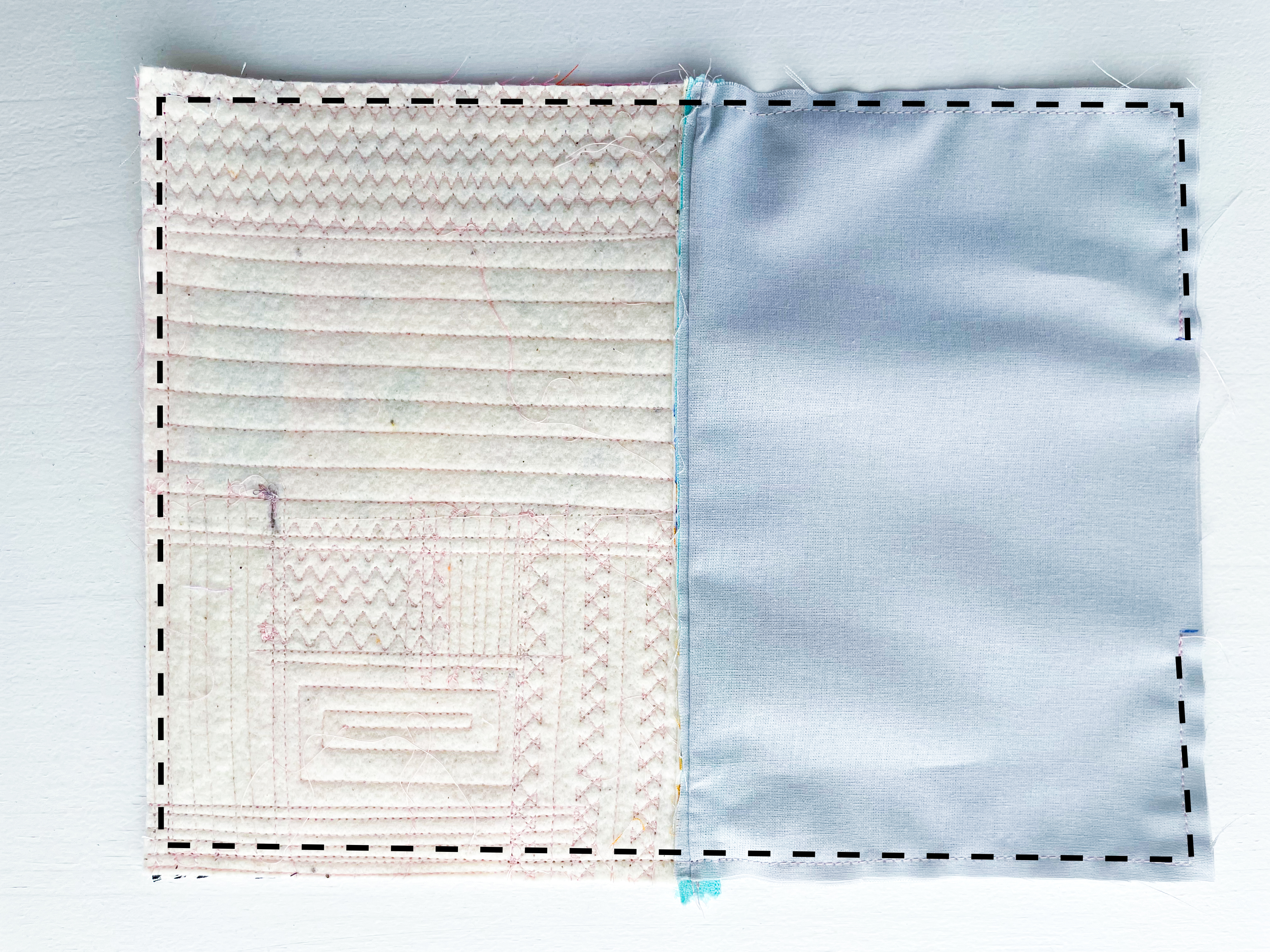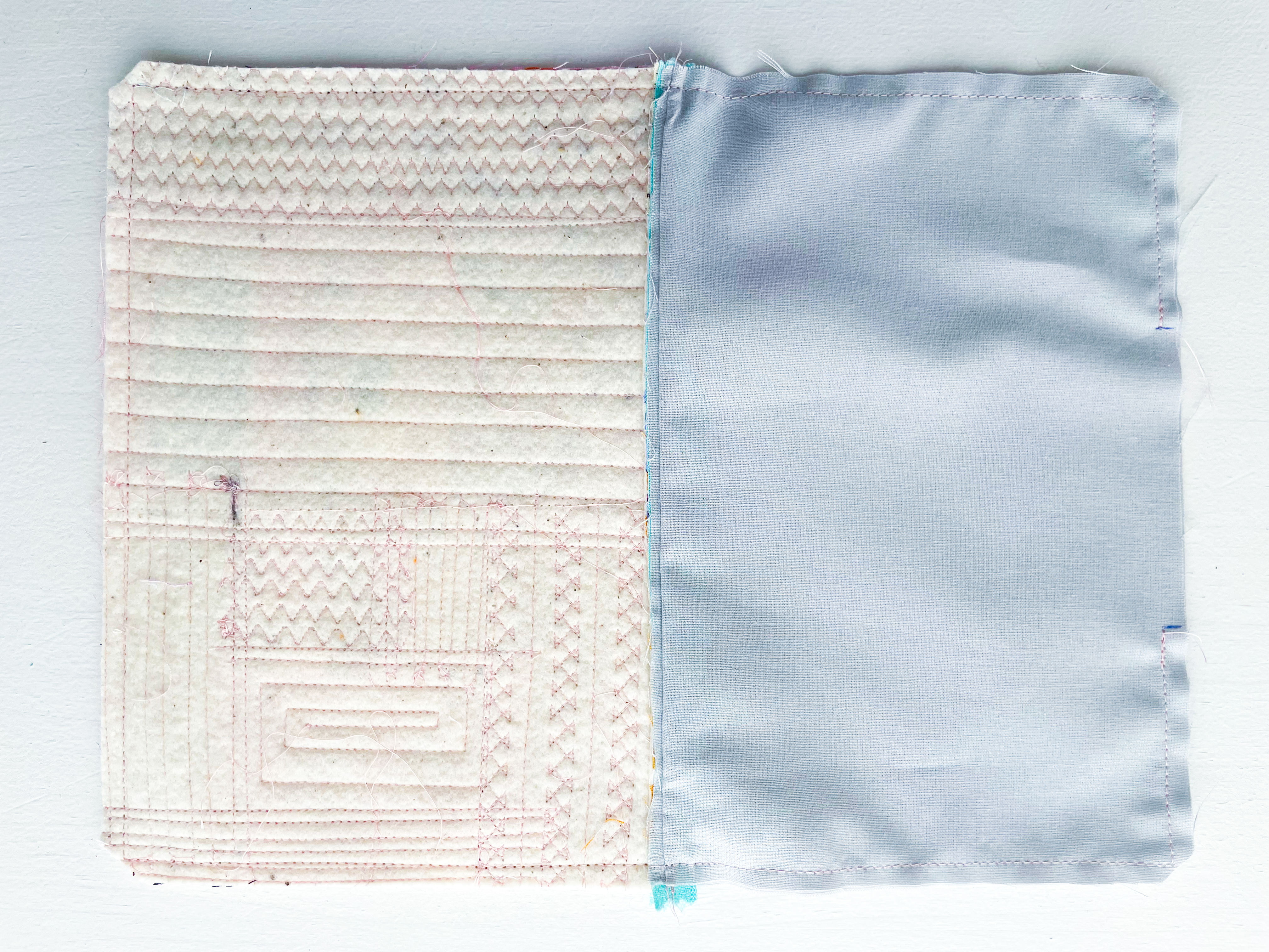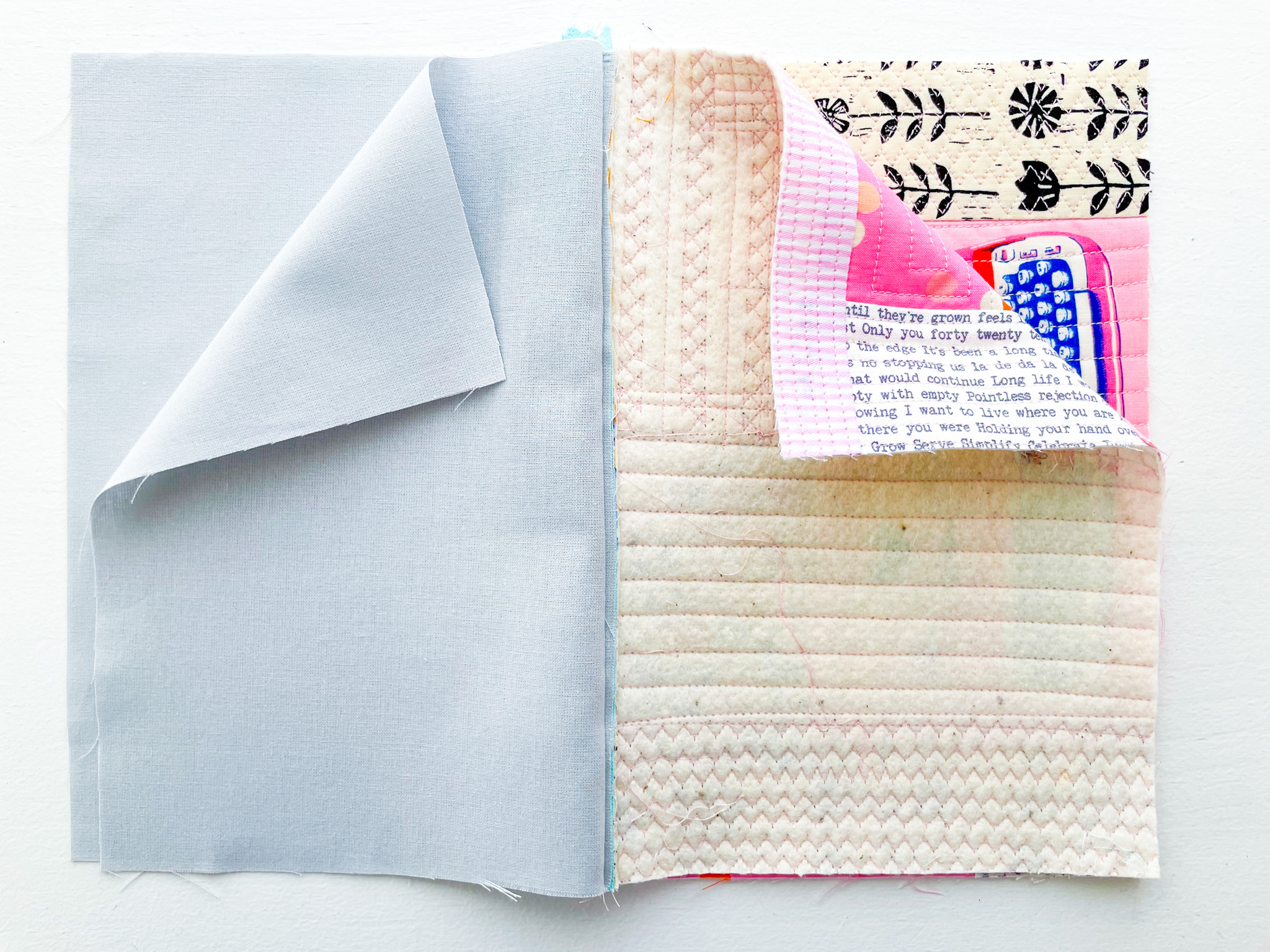 Open up your fabric and give it a good press. Then quilt the second piece of fabric down using your preferred quilting style — straight lines, decorative stitches, or free-motion quilting.