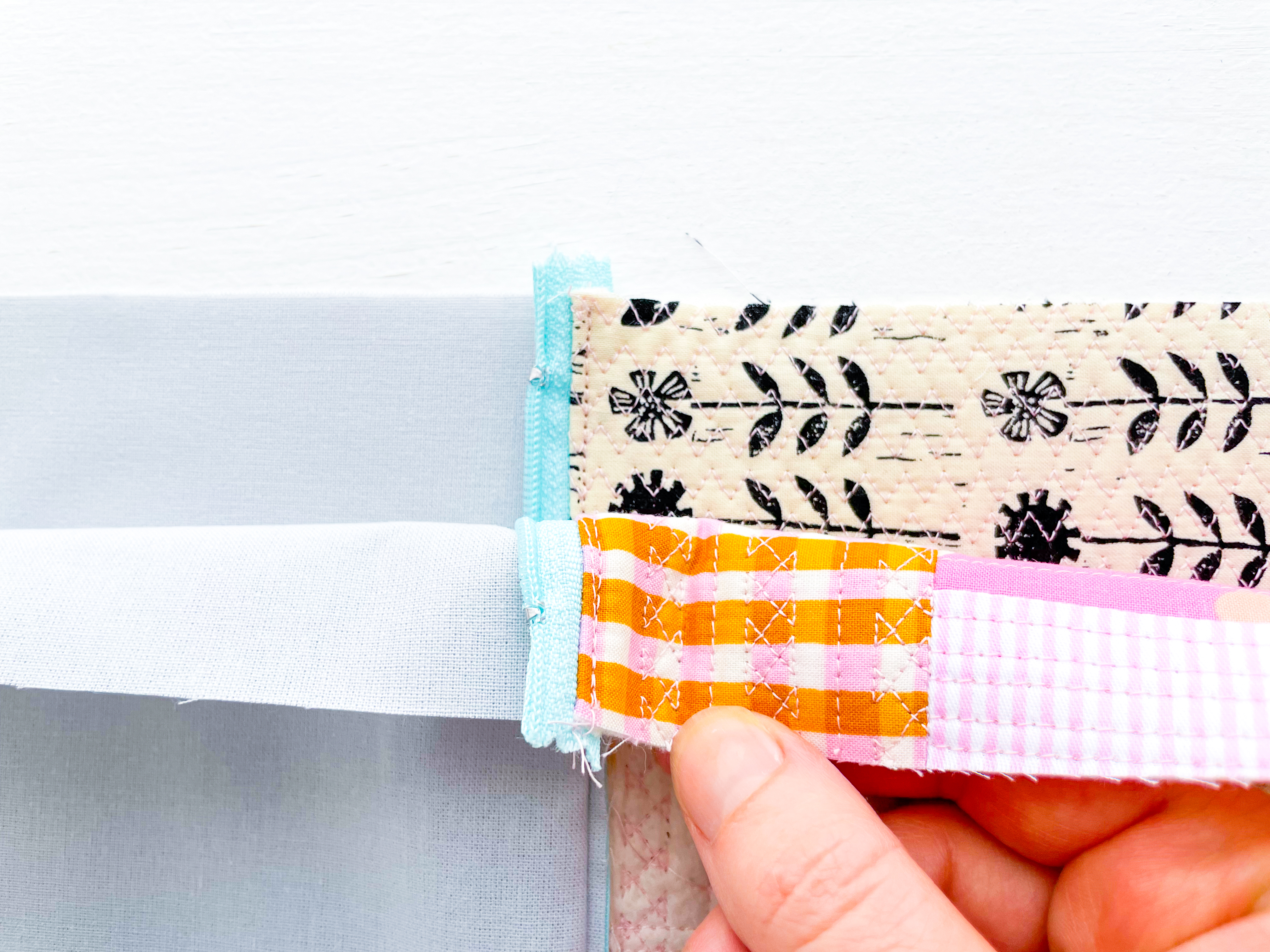 Once your quilt-as-you-go panels are complete, it’s time to turn them into a zipper pouch. Here’s what you’ll need for this project:
