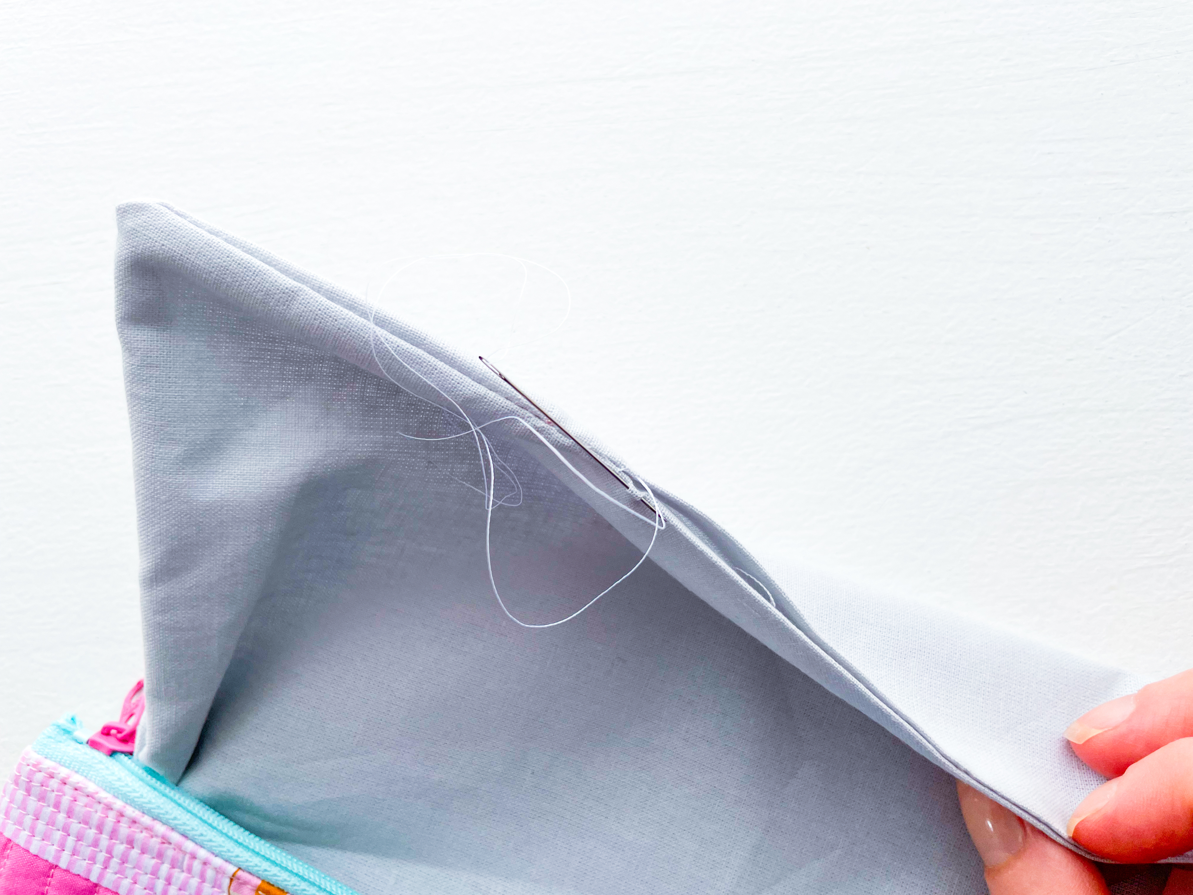 Turn the pouch right side out through the opening in the lining. Use a seam turner to gently push out the corners and seams. Sew the lining opening closed using a ladder (invisible) stitch.