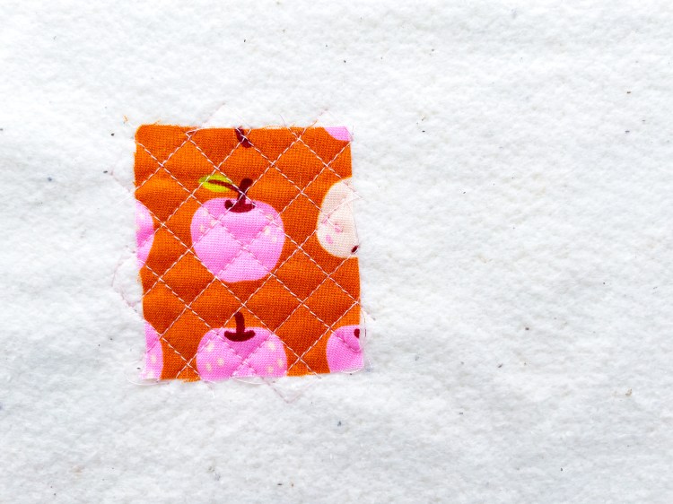 Place your first scrap in the center of the batting and quilt it down. You can keep it simple with straight lines, try free-motion quilting, or experiment with decorative stitches on your machine.