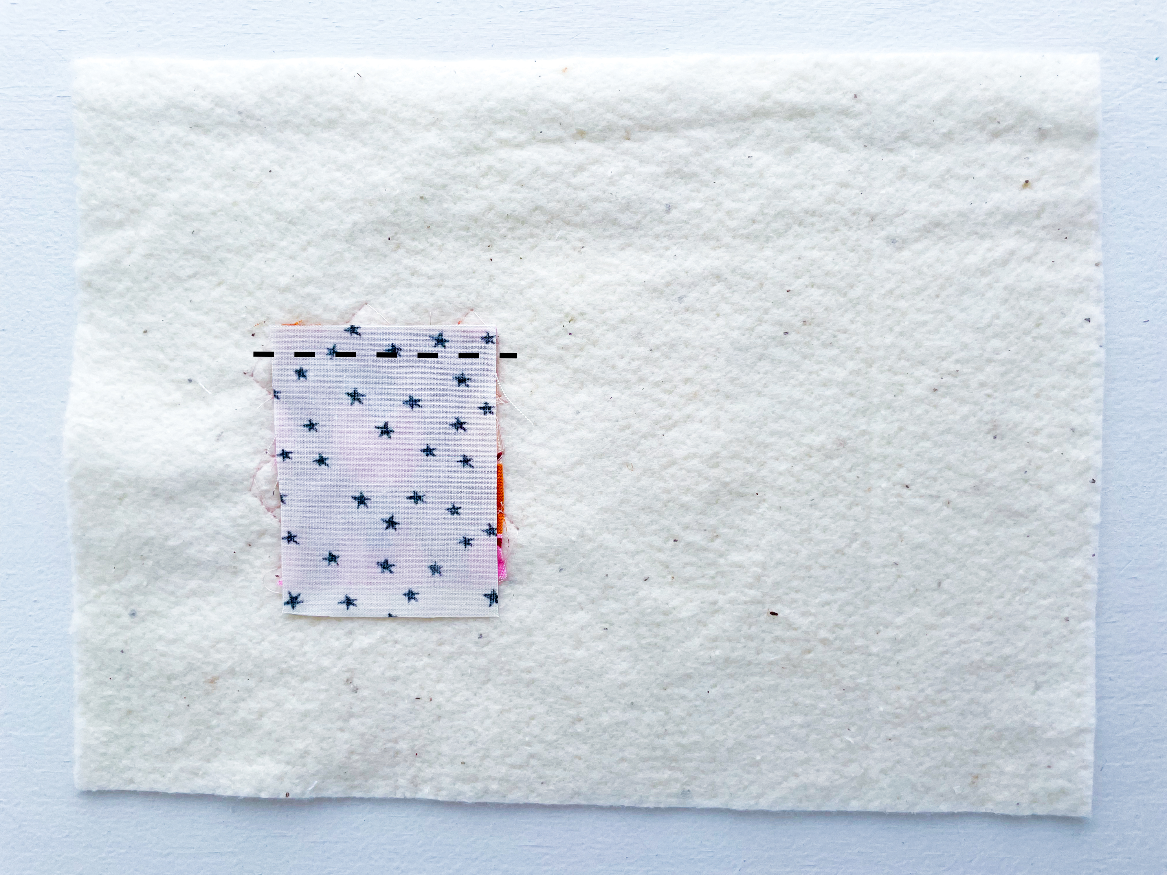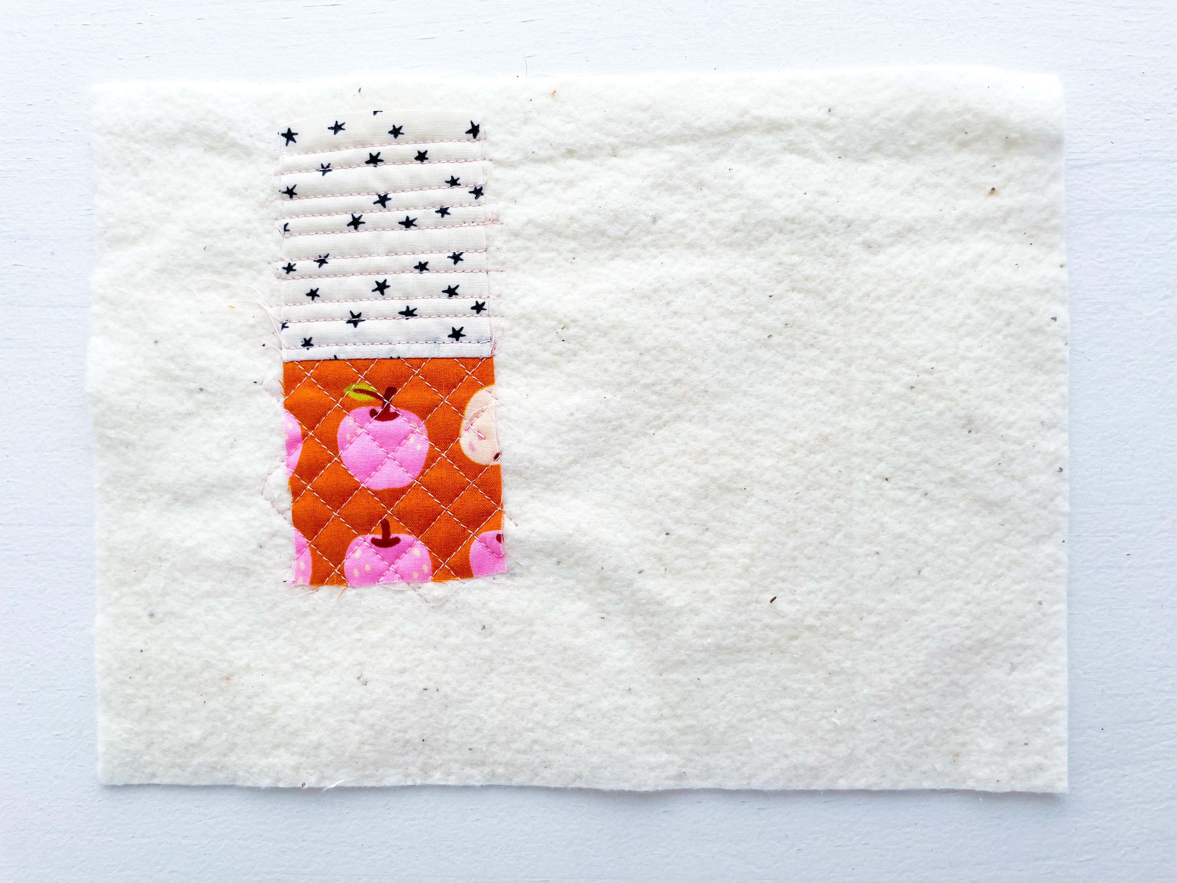 Take your time with this first piece — it sets the foundation for your quilt-as-you-go panel, so don’t worry about perfection. Part of the charm is the texture and dimension that develops as you add more scraps.