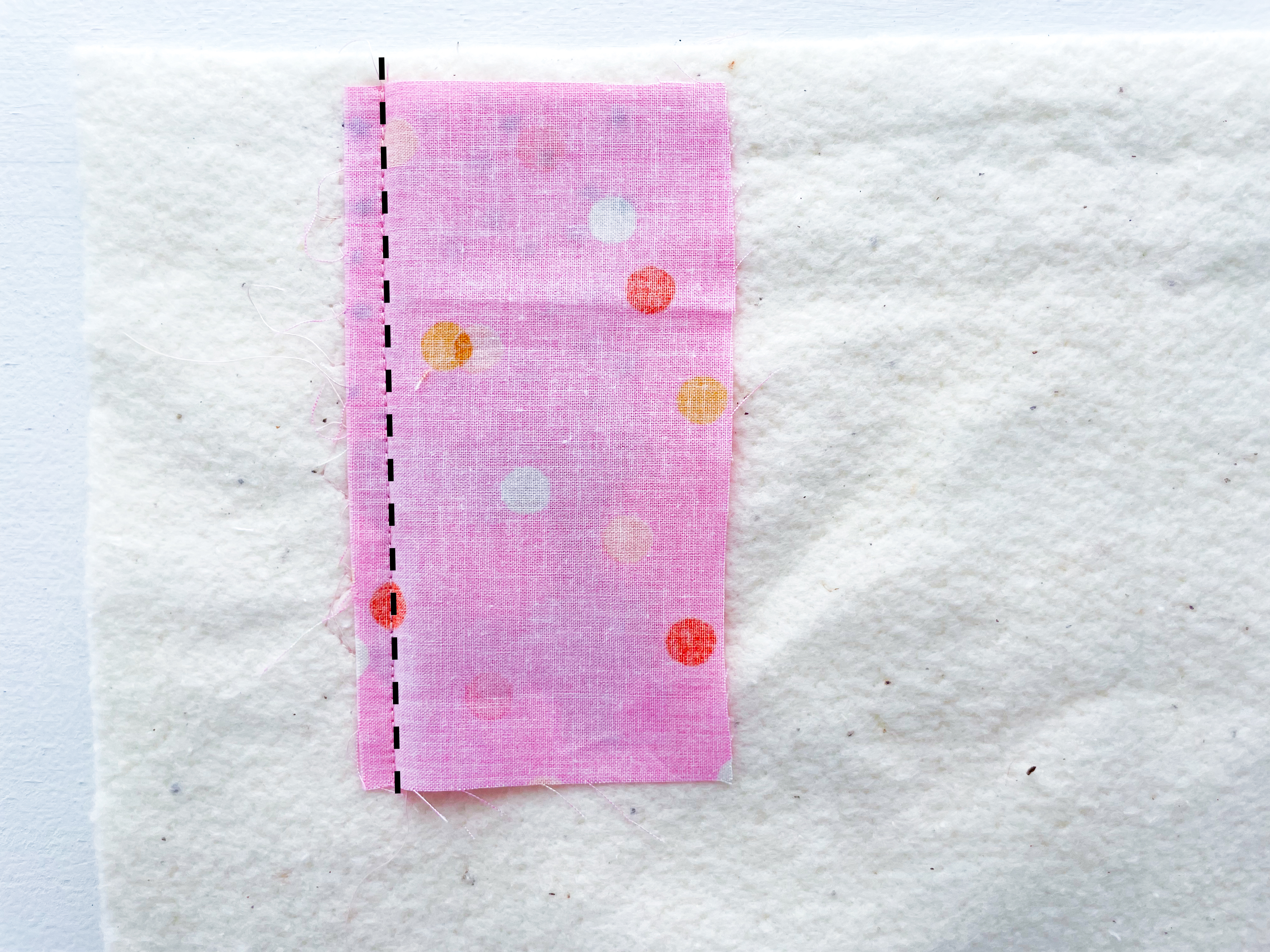 Choose your second fabric and place it along one side of your first piece, with right sides together. It can be whichever side you like, but try to make the edges roughly the same length.