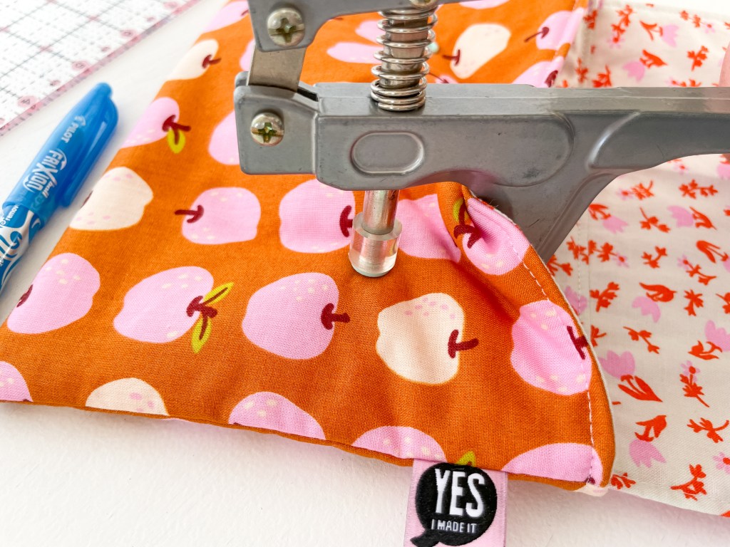 Mark on your fabric where you will insert your snap with a removable fabric marker. In my patchwork snap pouch pattern, I tell you exactly where to insert the snaps for each sized pouch.