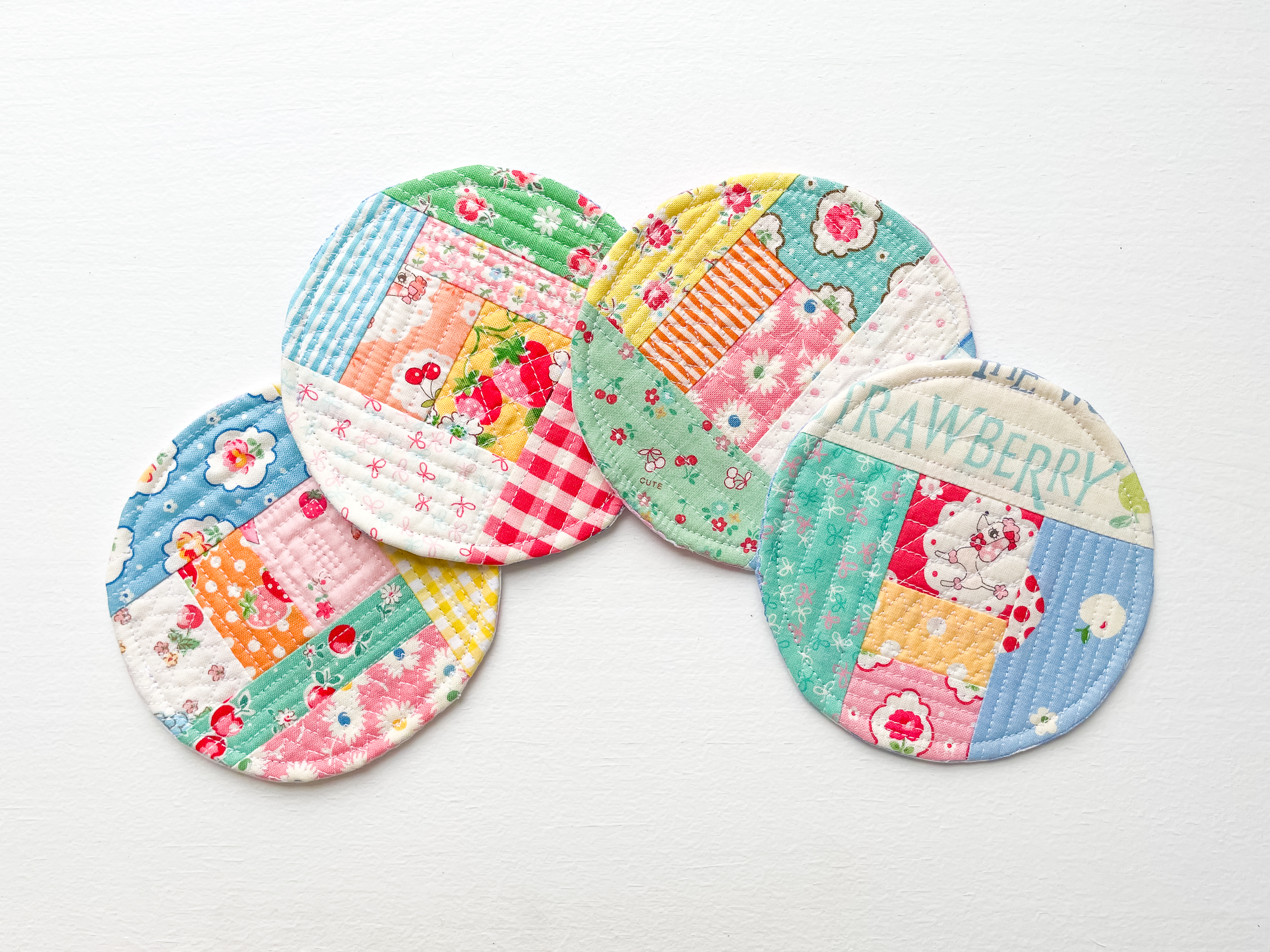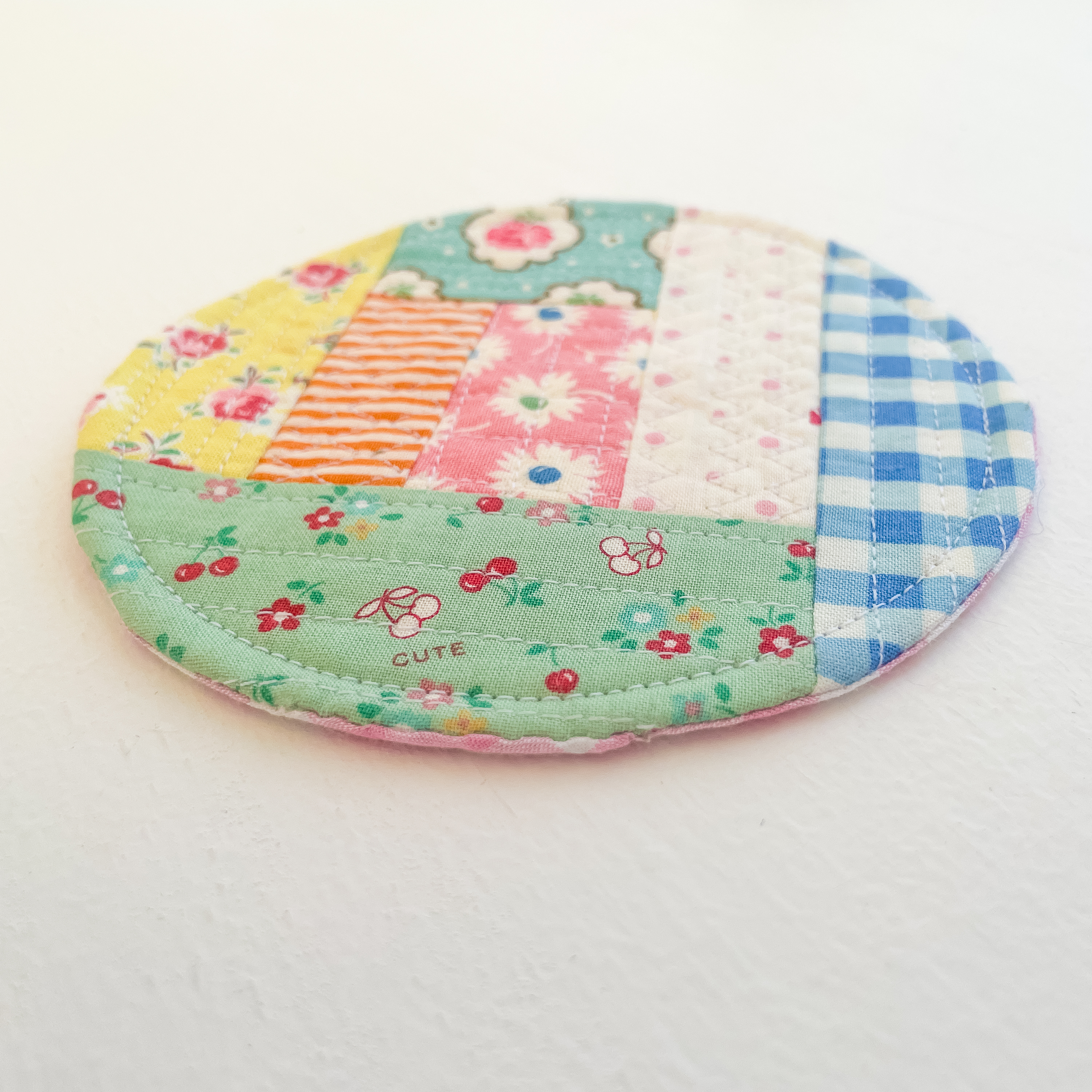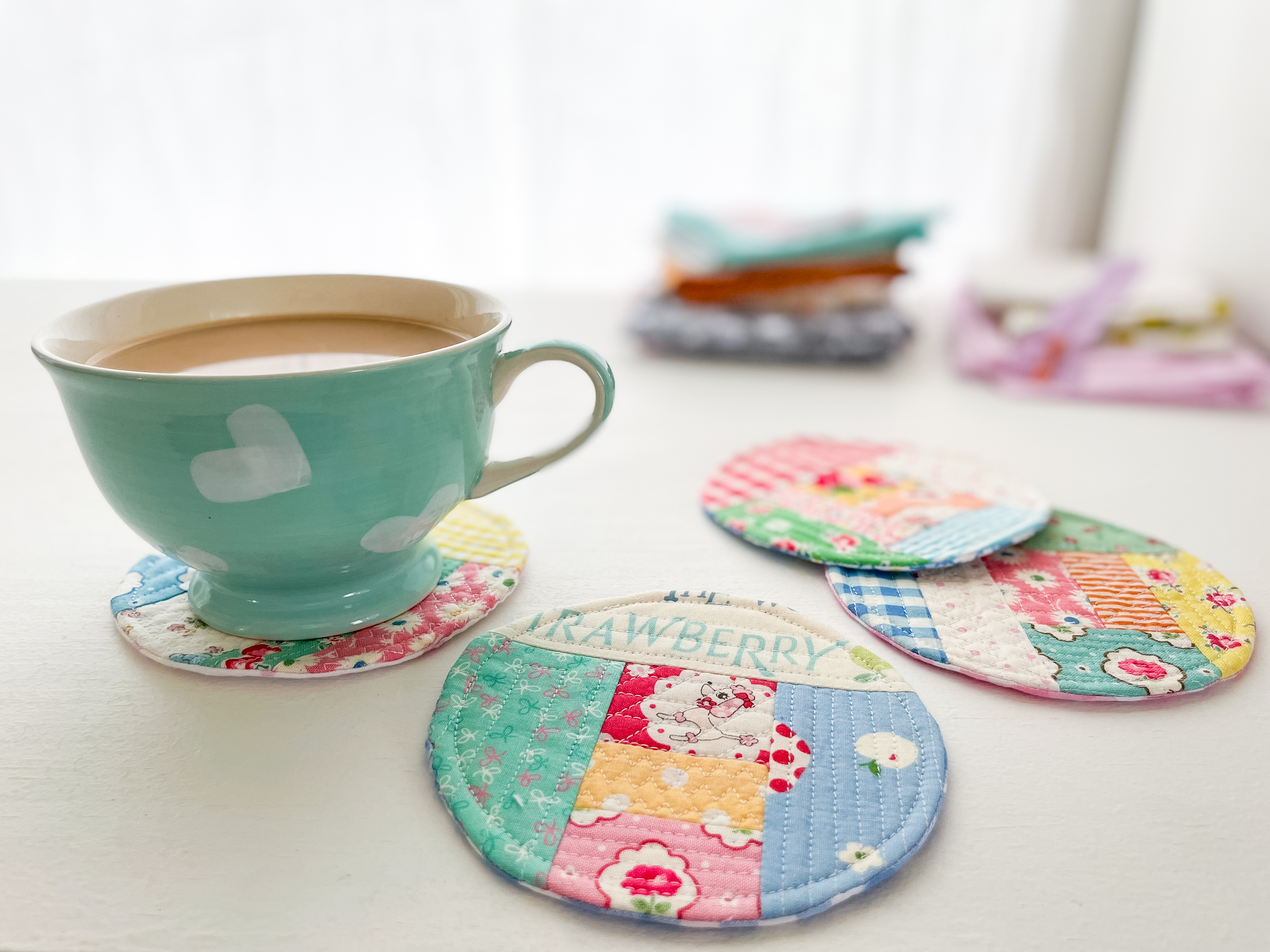 Last month I shared a simple scrappy zipper pouch. This month I thought it would be fun to make some scrappy round Quilt as you go coasters. After all I love a project that’s just as fun as it is useful. I also thought I needed a new Coaster for beside my machine as I love to enjoy a good cup of tea when I sew.