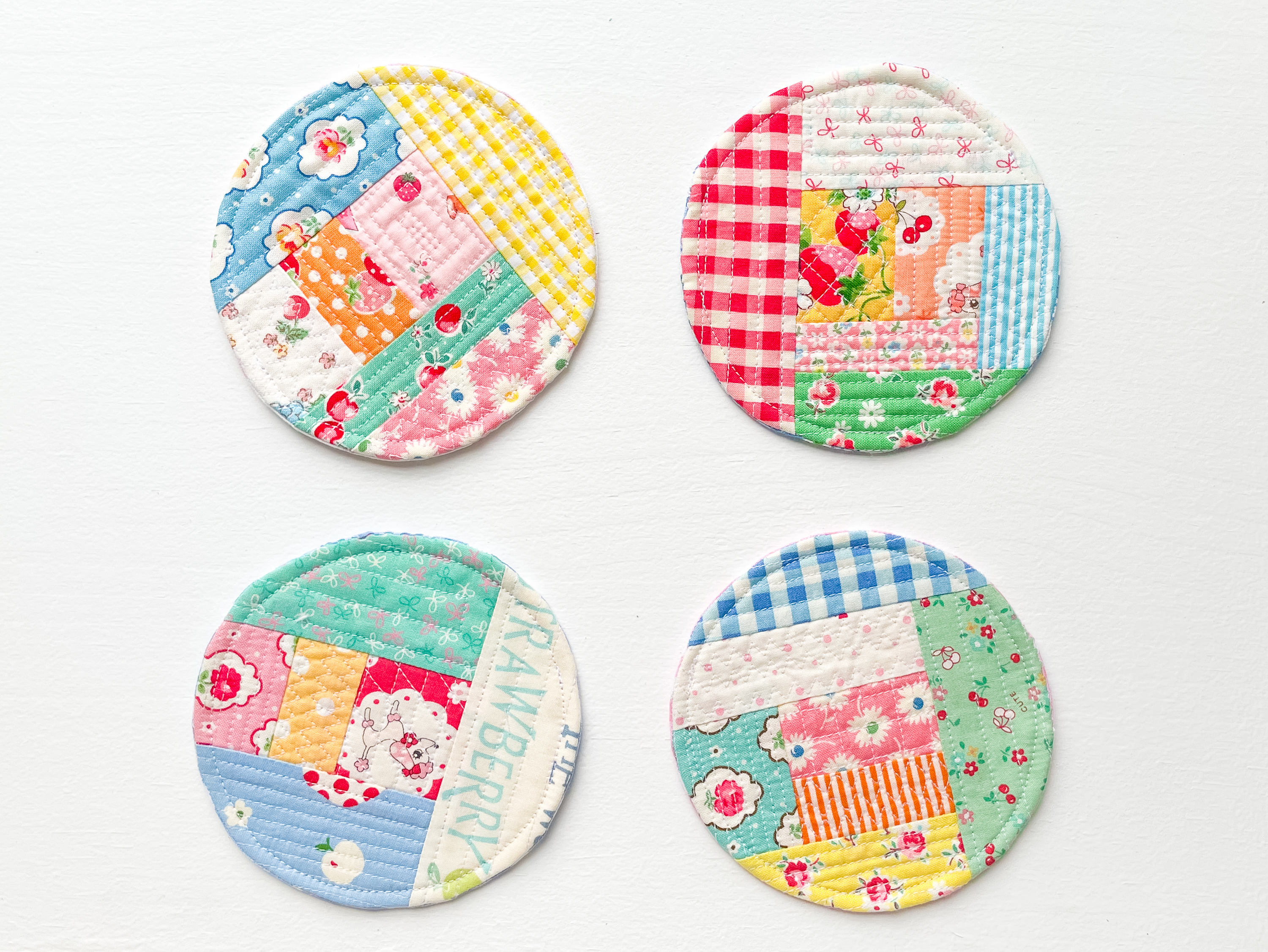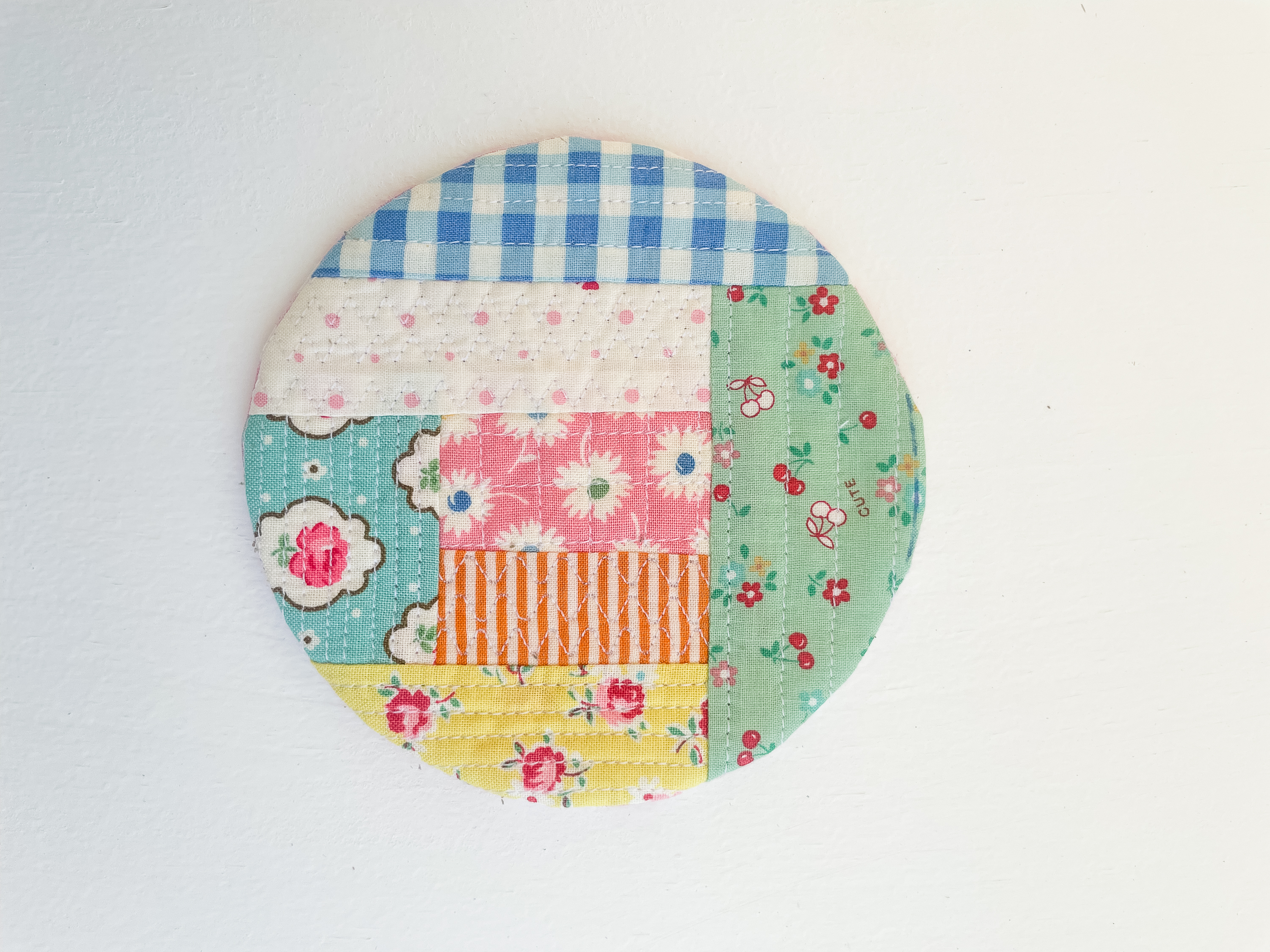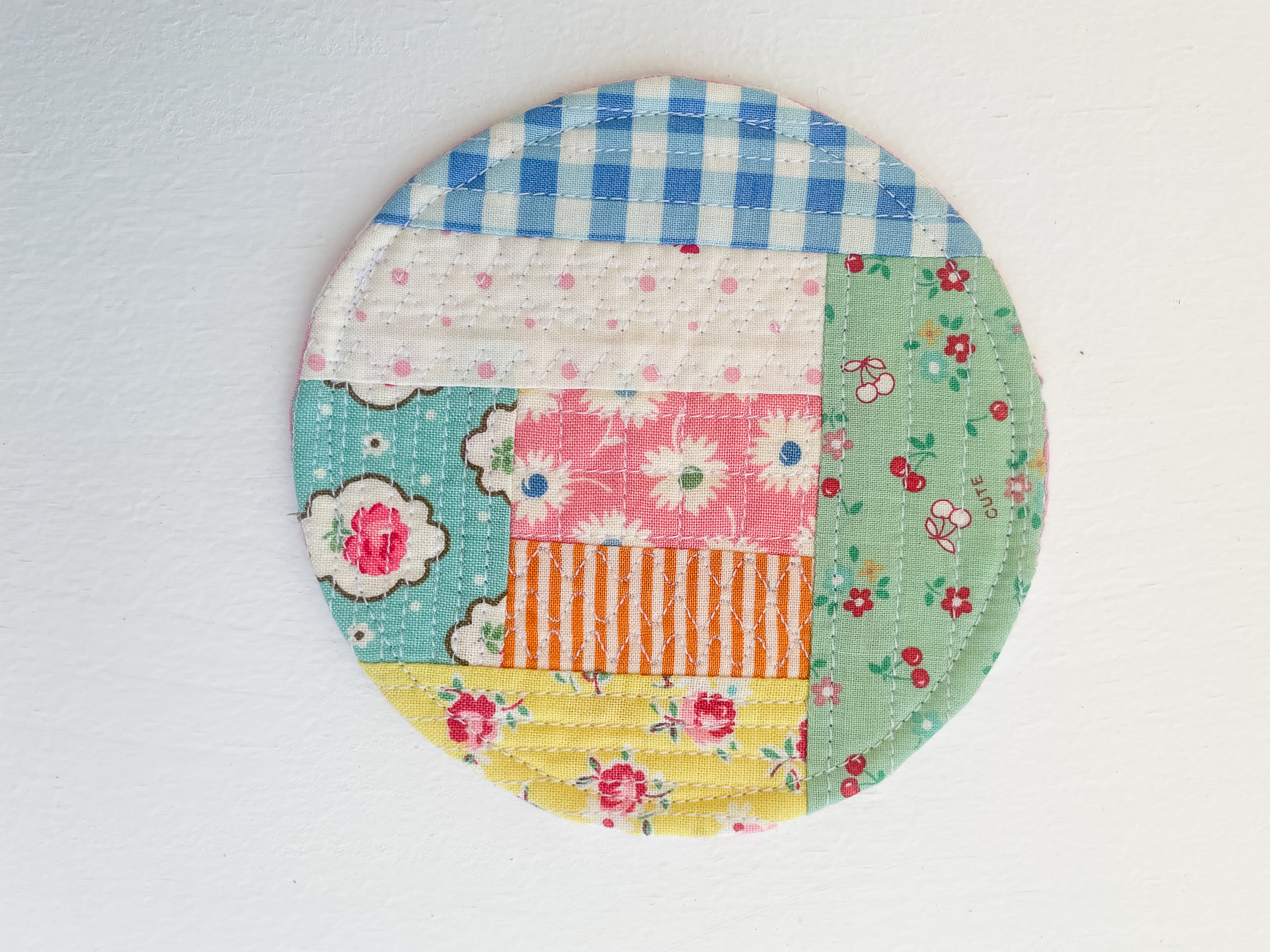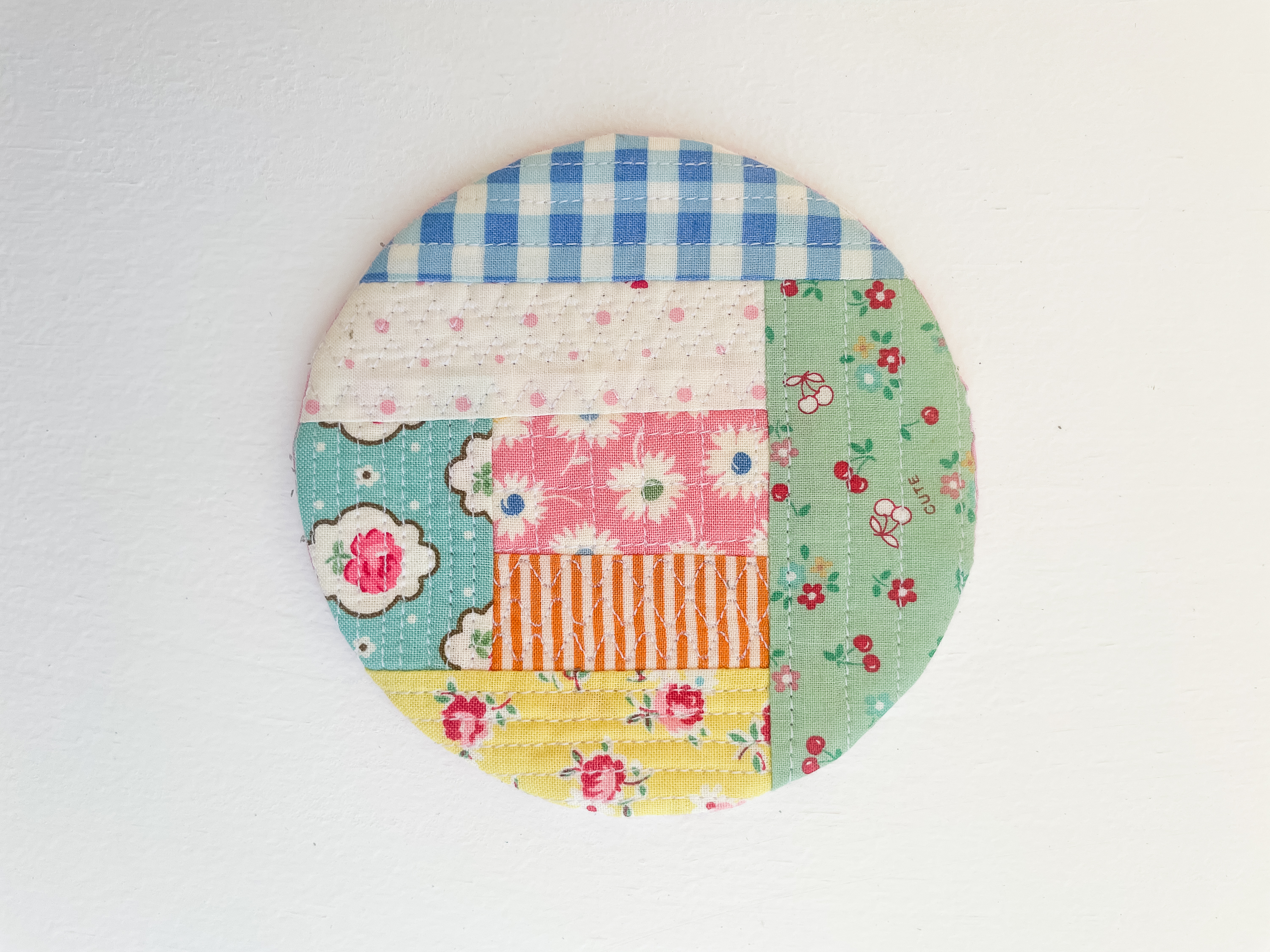 Last month I shared a simple scrappy zipper pouch. This month I thought it would be fun to make some scrappy round Quilt as you go coasters. After all I love a project that’s just as fun as it is useful. I also thought I needed a new Coaster for beside my machine as I love to enjoy a good cup of tea when I sew.