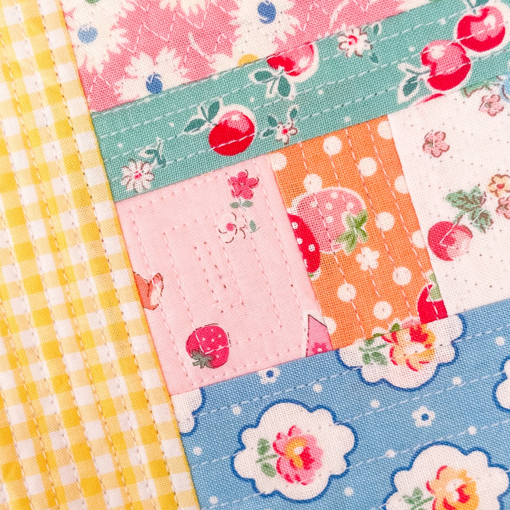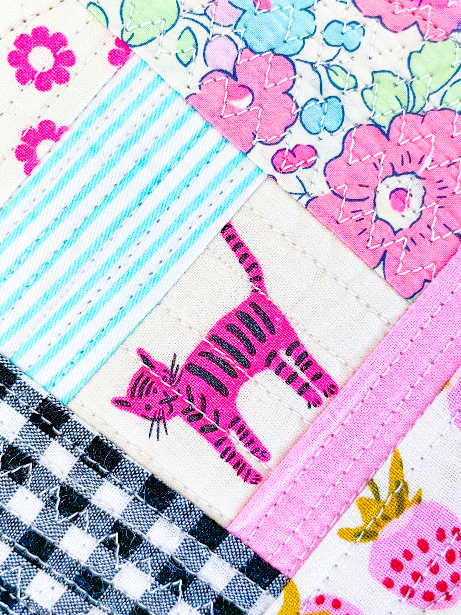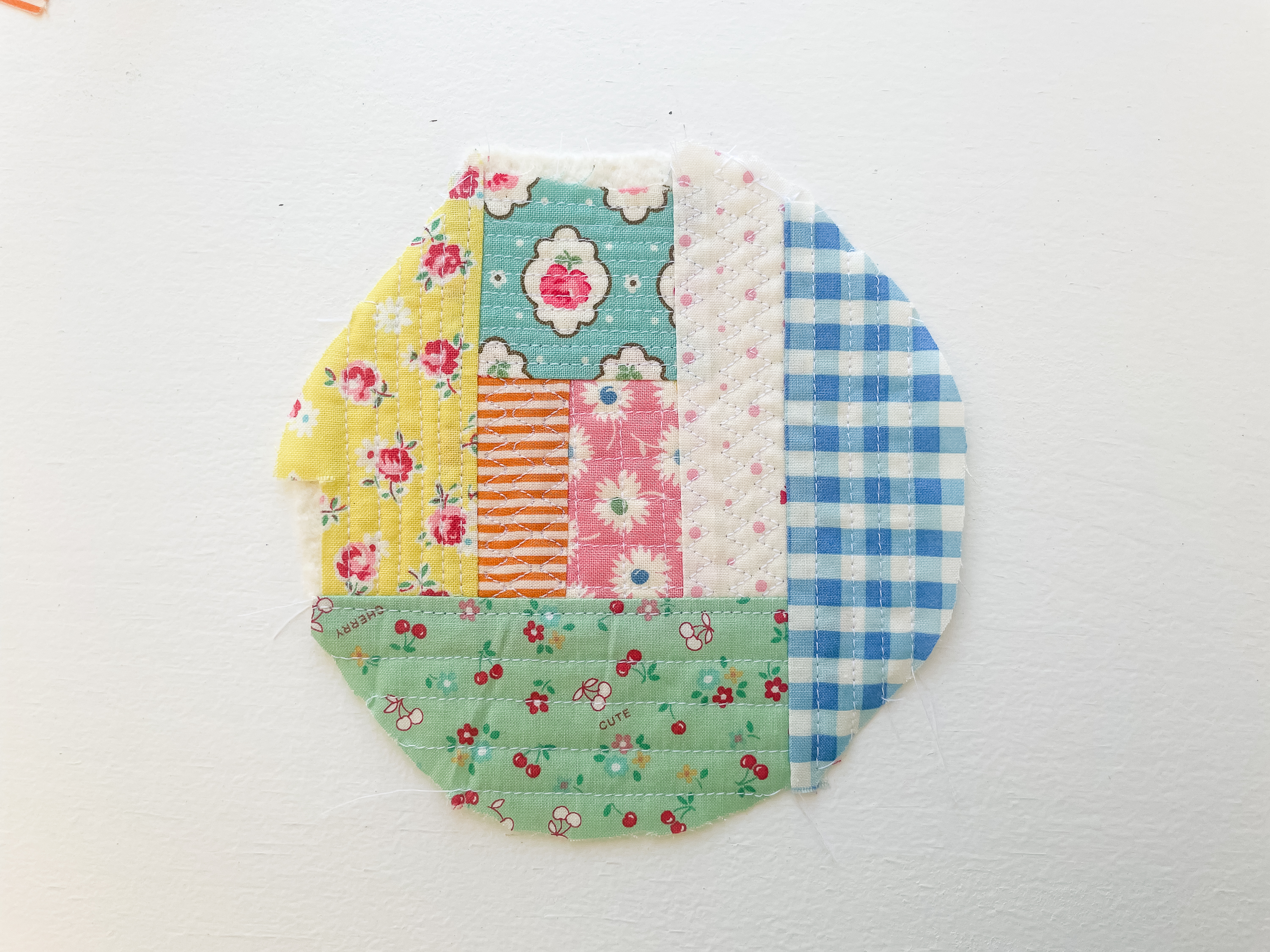 3. Keep adding your fabric scraps. Quilt them down as you go. (For a full QAYG tutorial see here).