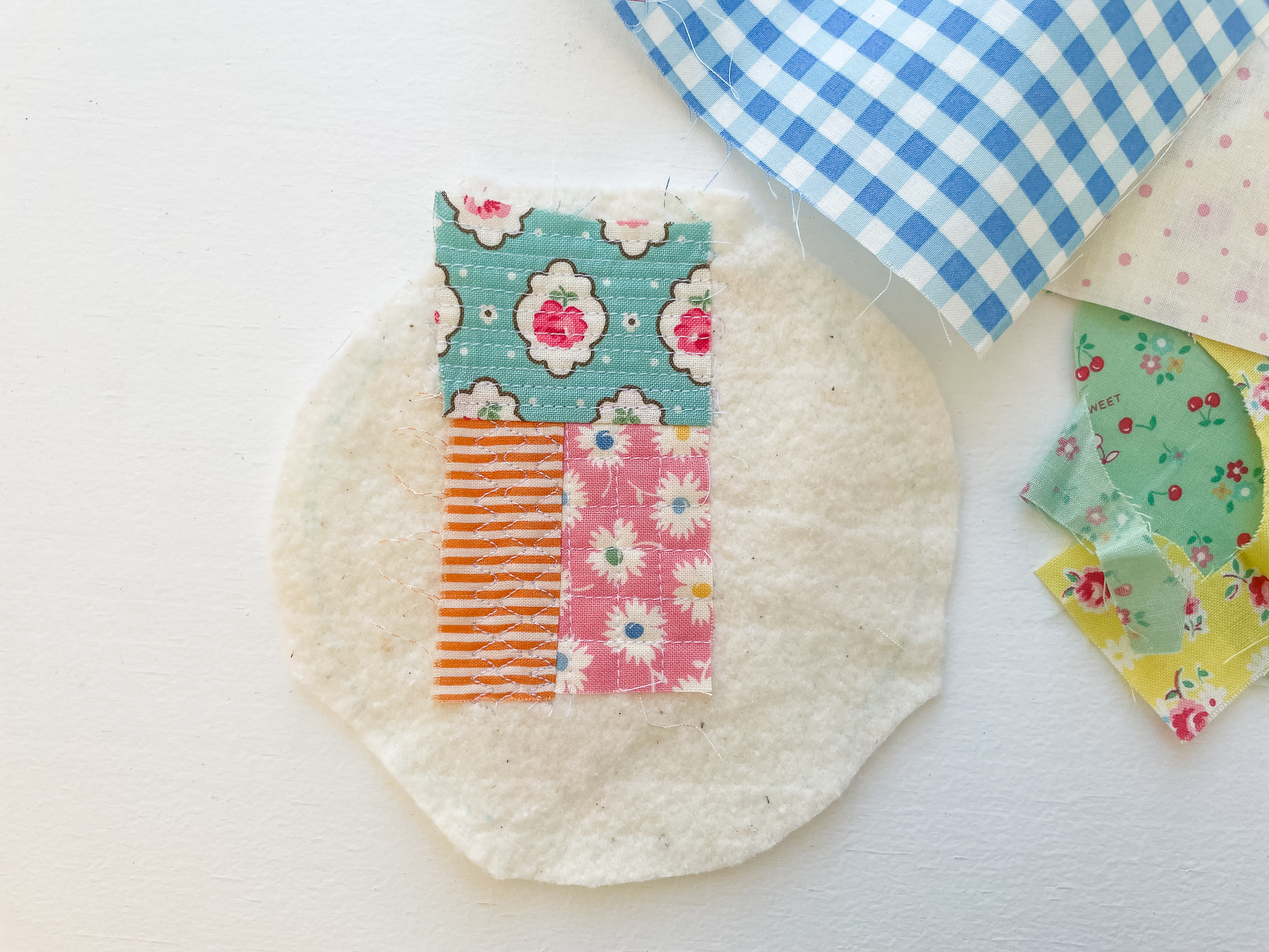 2. Take your fabric scraps and start adding them to your circle (starting in the middle) by using the quilt as you go method. You simply place the piece of fabric on the batting and quilt it down onto the batting. My starting scrap was about 1 ½” x 2 ½” you can start with a square as small as 1 ½” x 1 ½” if you like.