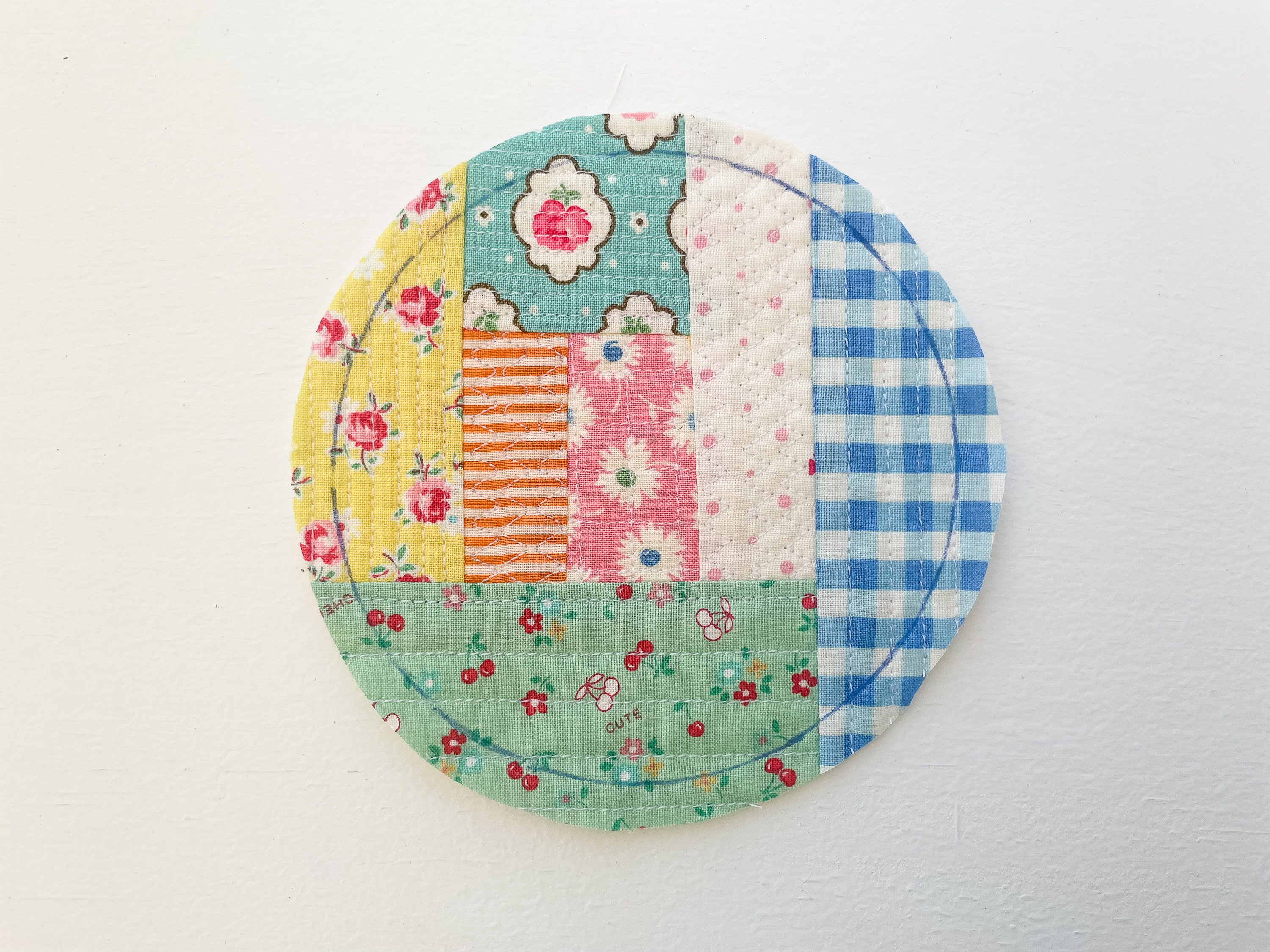 5. Take your circle template and place it over the top of your coaster and trace around it using an erasable marker (I’m nuts about Frixion pens). Trim around your circle leaving a 3/8” seam allowance. NOT on the line, 3/8” from the outside edge of the circle.