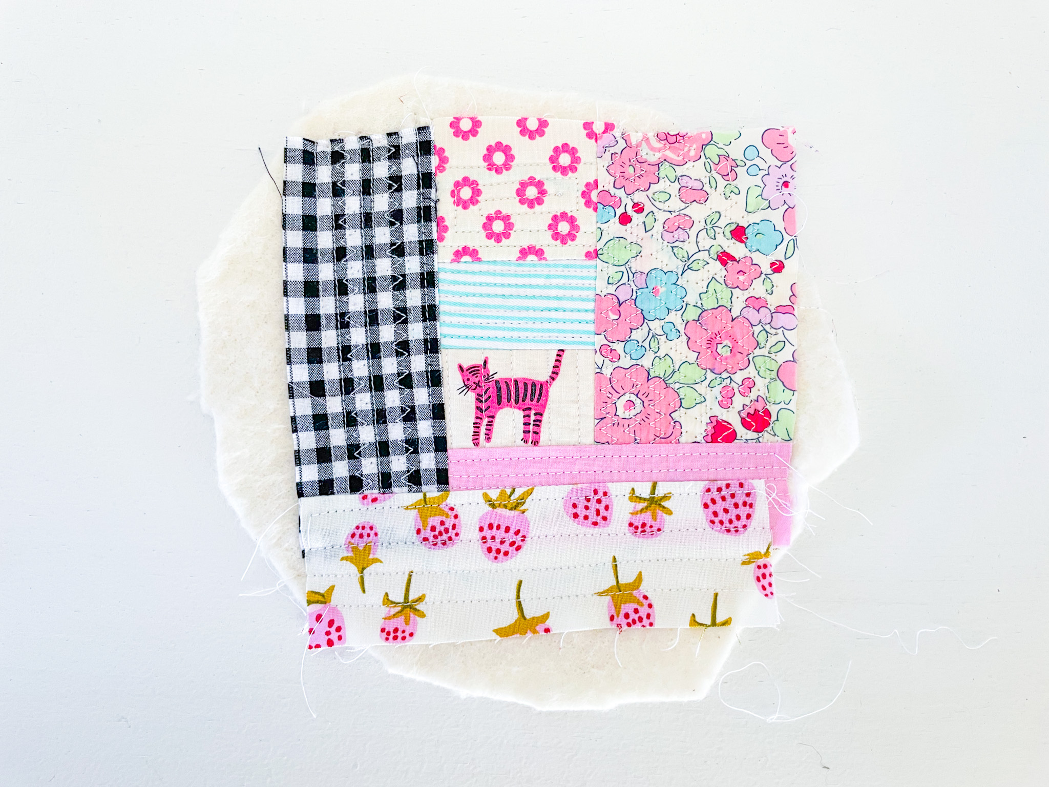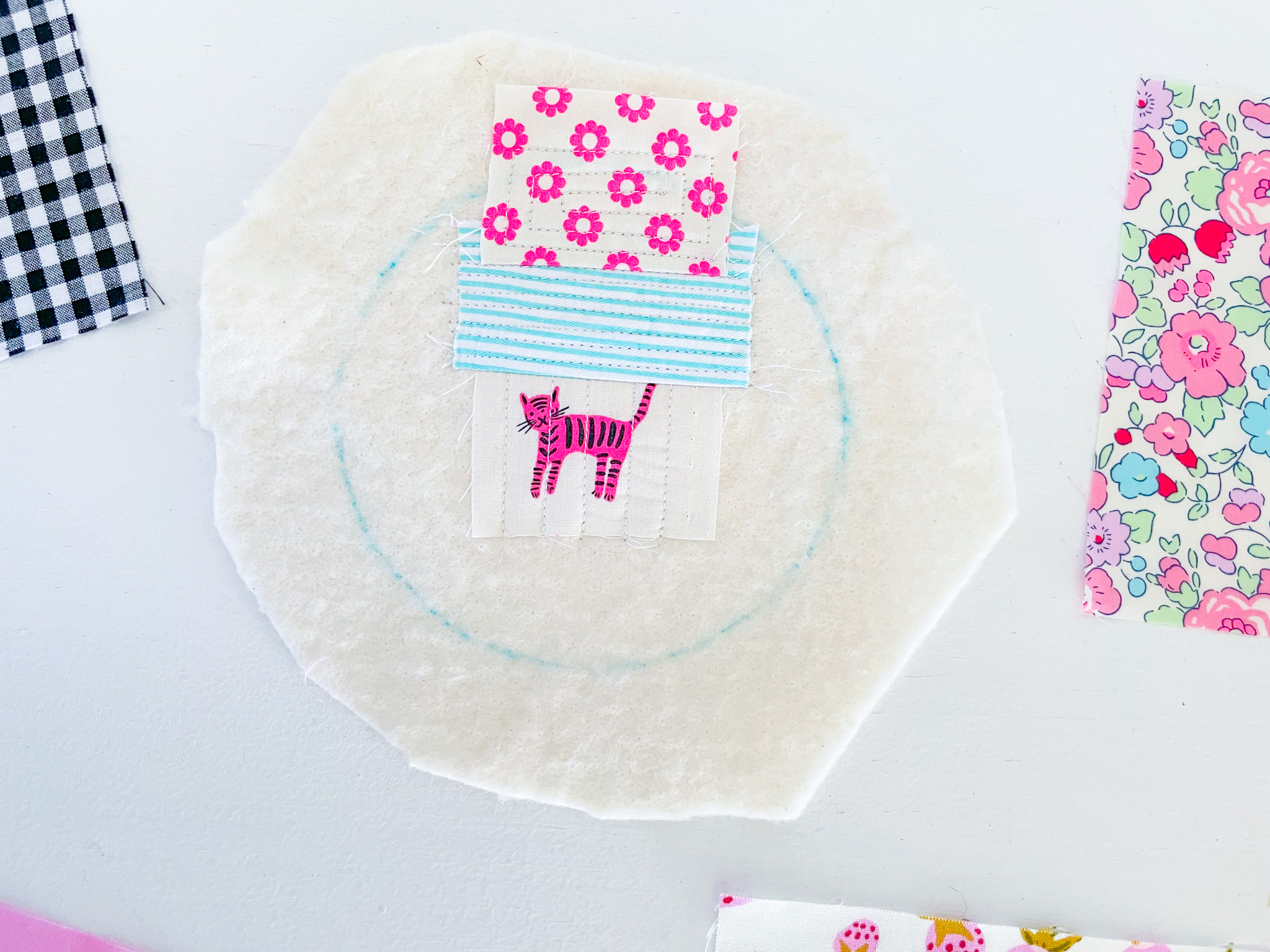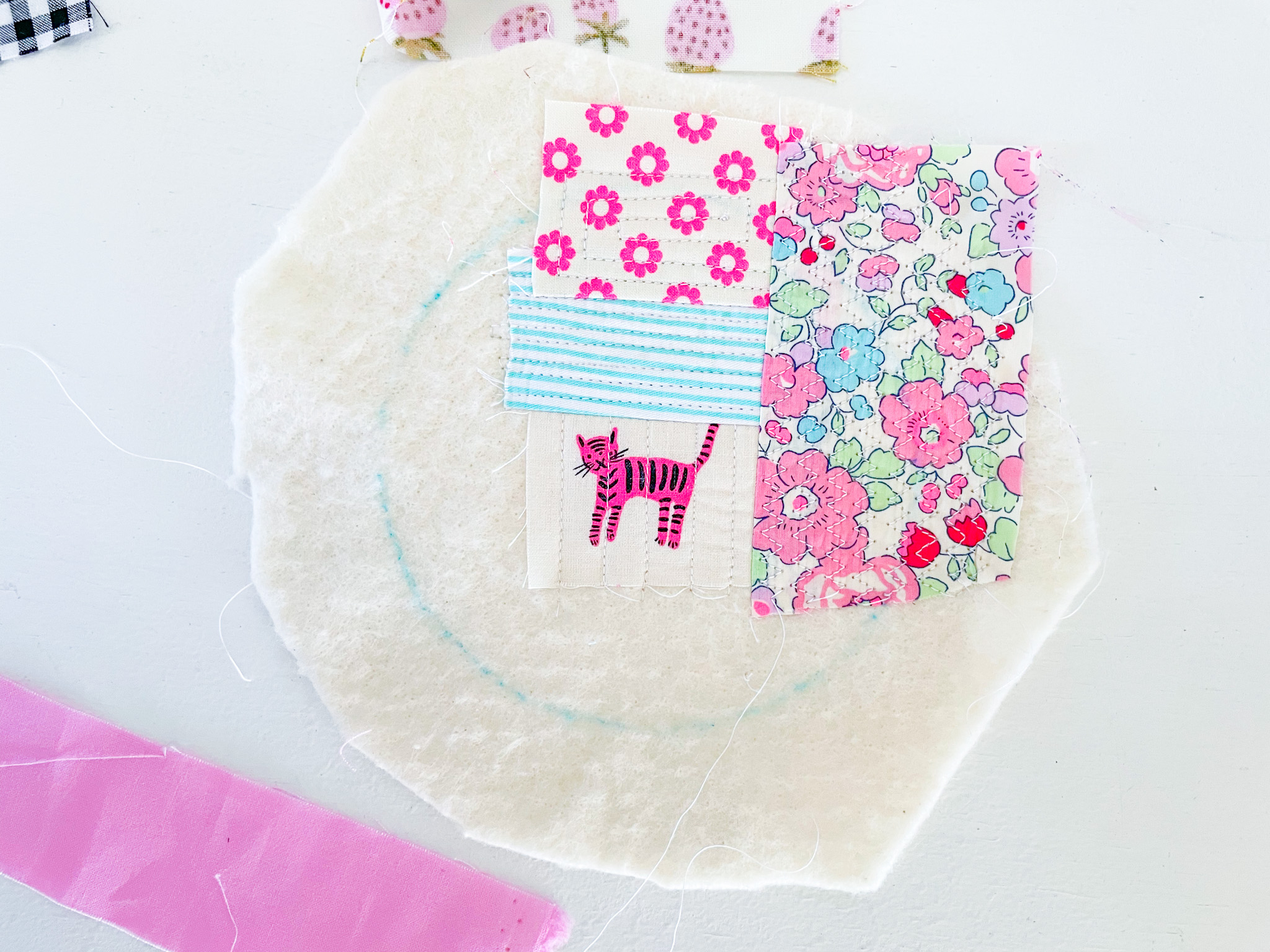 2. Begin in the centre of your circle and add your fabric scraps using the quilt-as-you-go method. Place a scrap right side up onto the batting, then quilt it down to secure it.