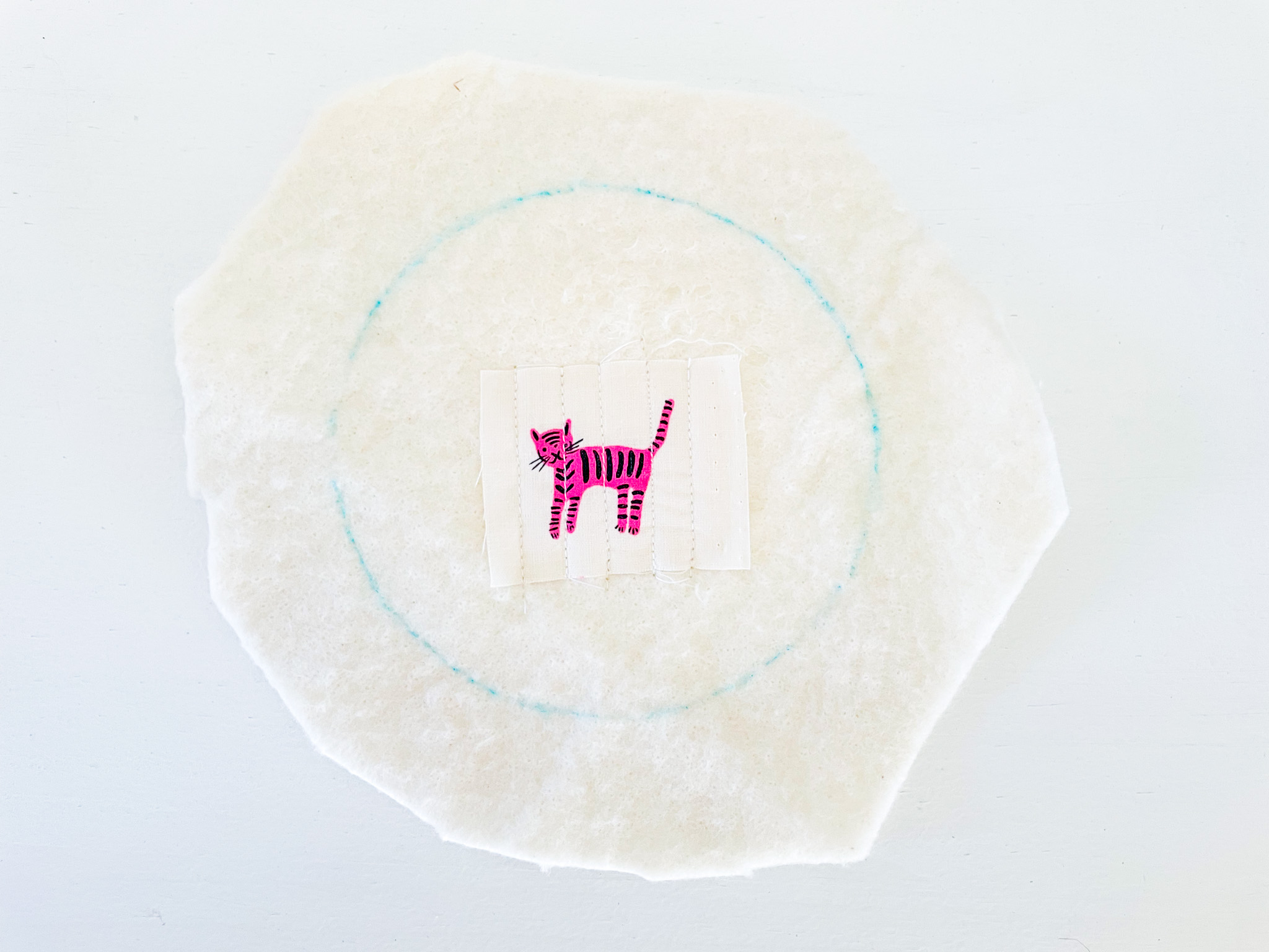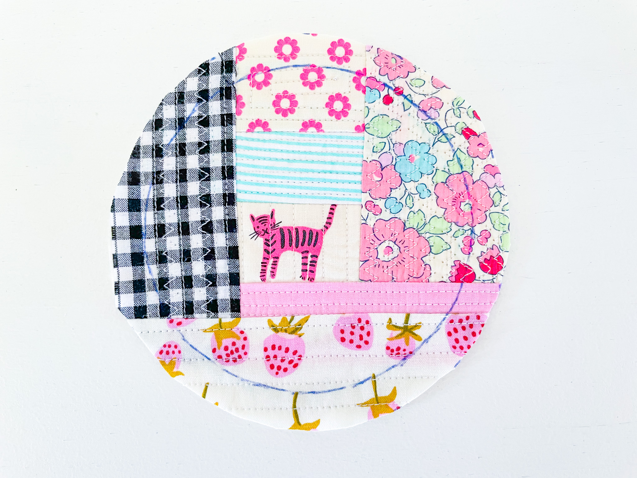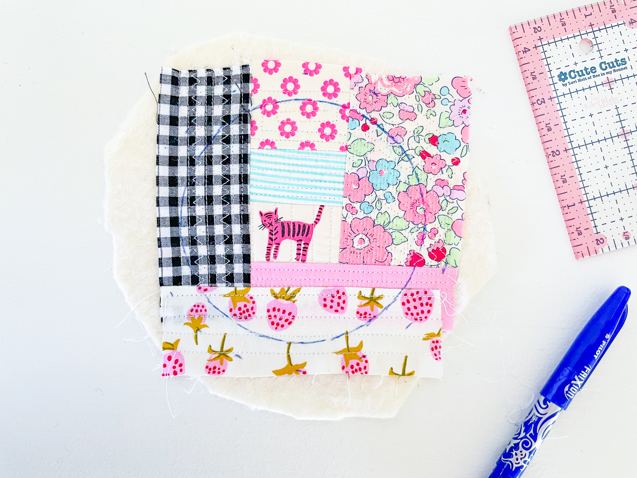 2. Begin in the centre of your circle and add your fabric scraps using the quilt-as-you-go method. Place a scrap right side up onto the batting, then quilt it down to secure it.