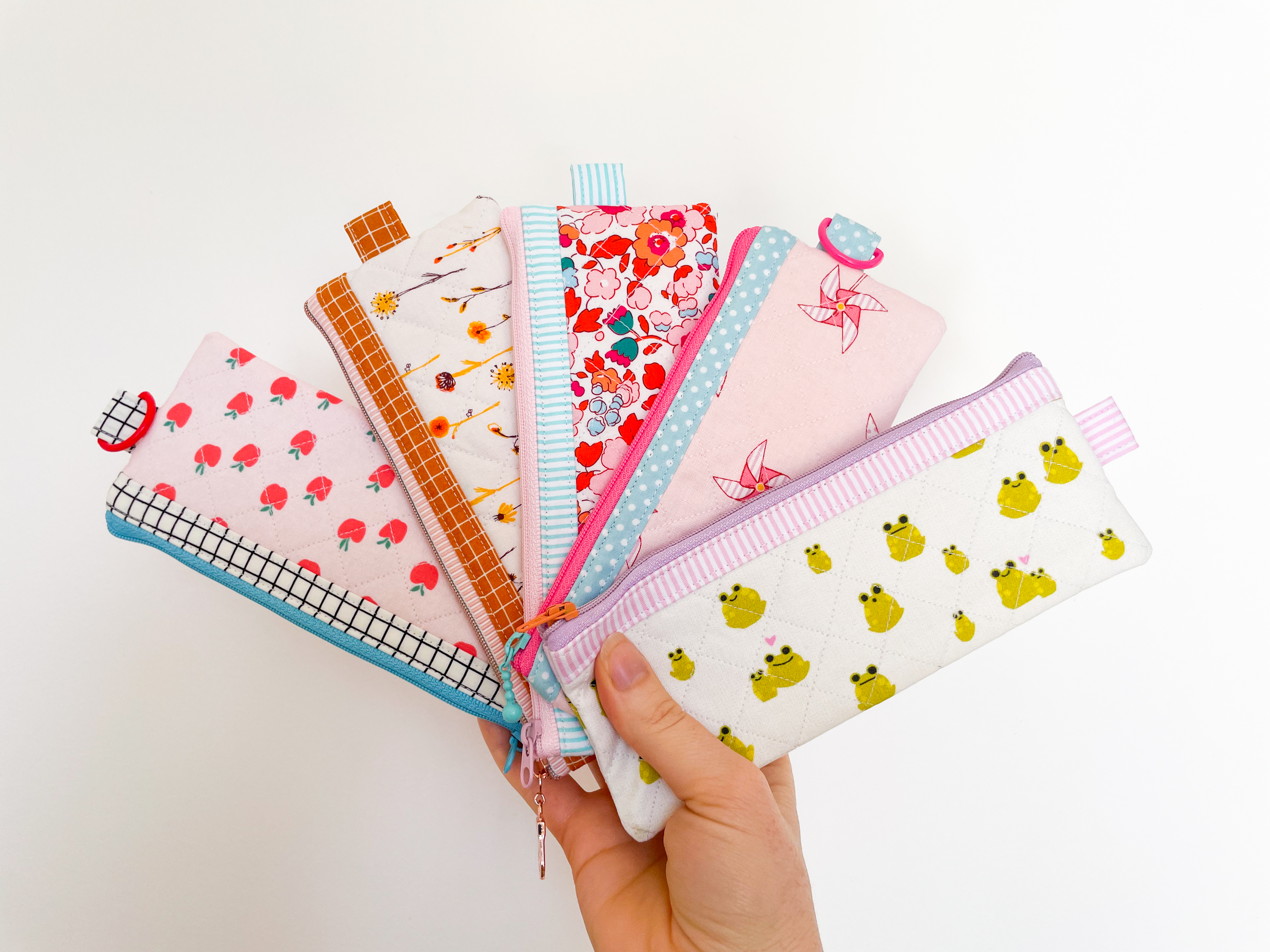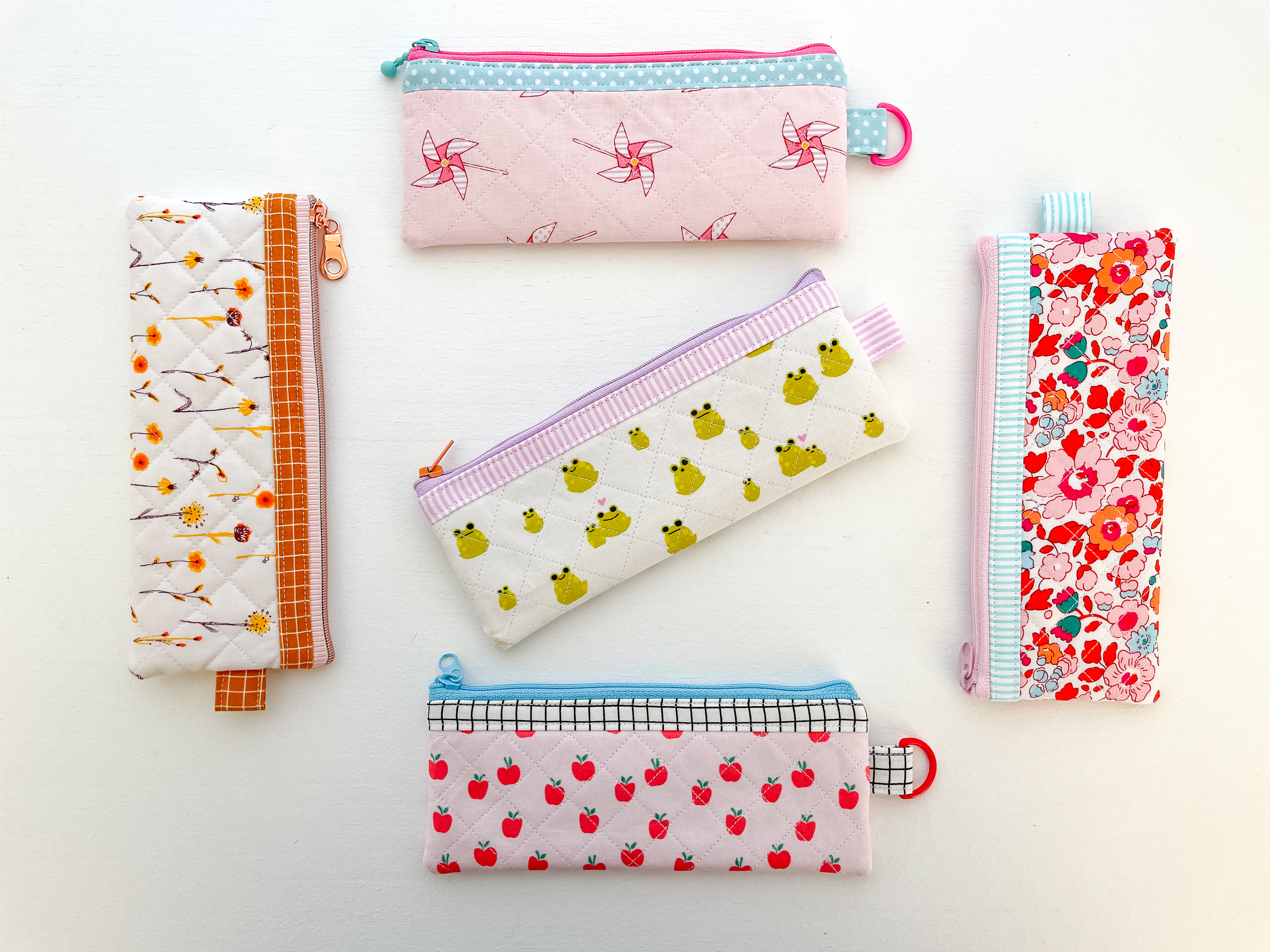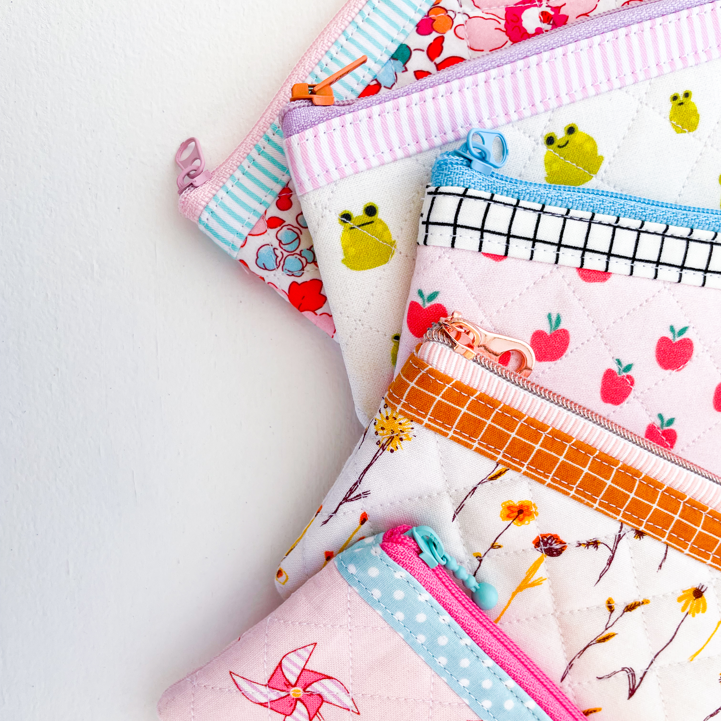 The Pixie Pencil Pouch is a tiny, slim zipper pouch with a contrasting zipper binding and pull tab and sweet squishy quilted texture. Perfect for using up small bits of leftover cotton batting or experimenting with contrasting fabric combinations. It finishes at just 8” x 3”. The smallest I could make it while still remaining functional.