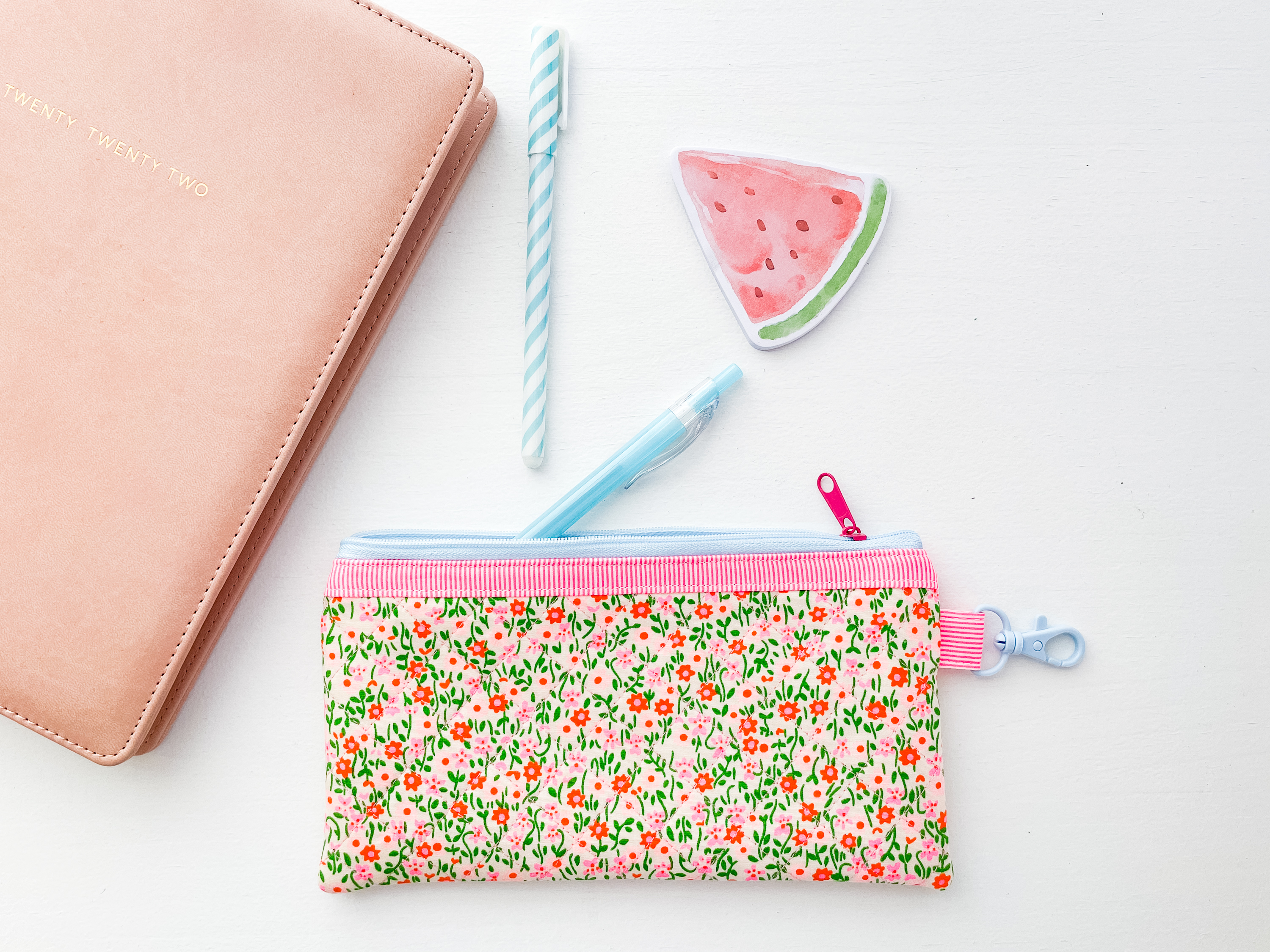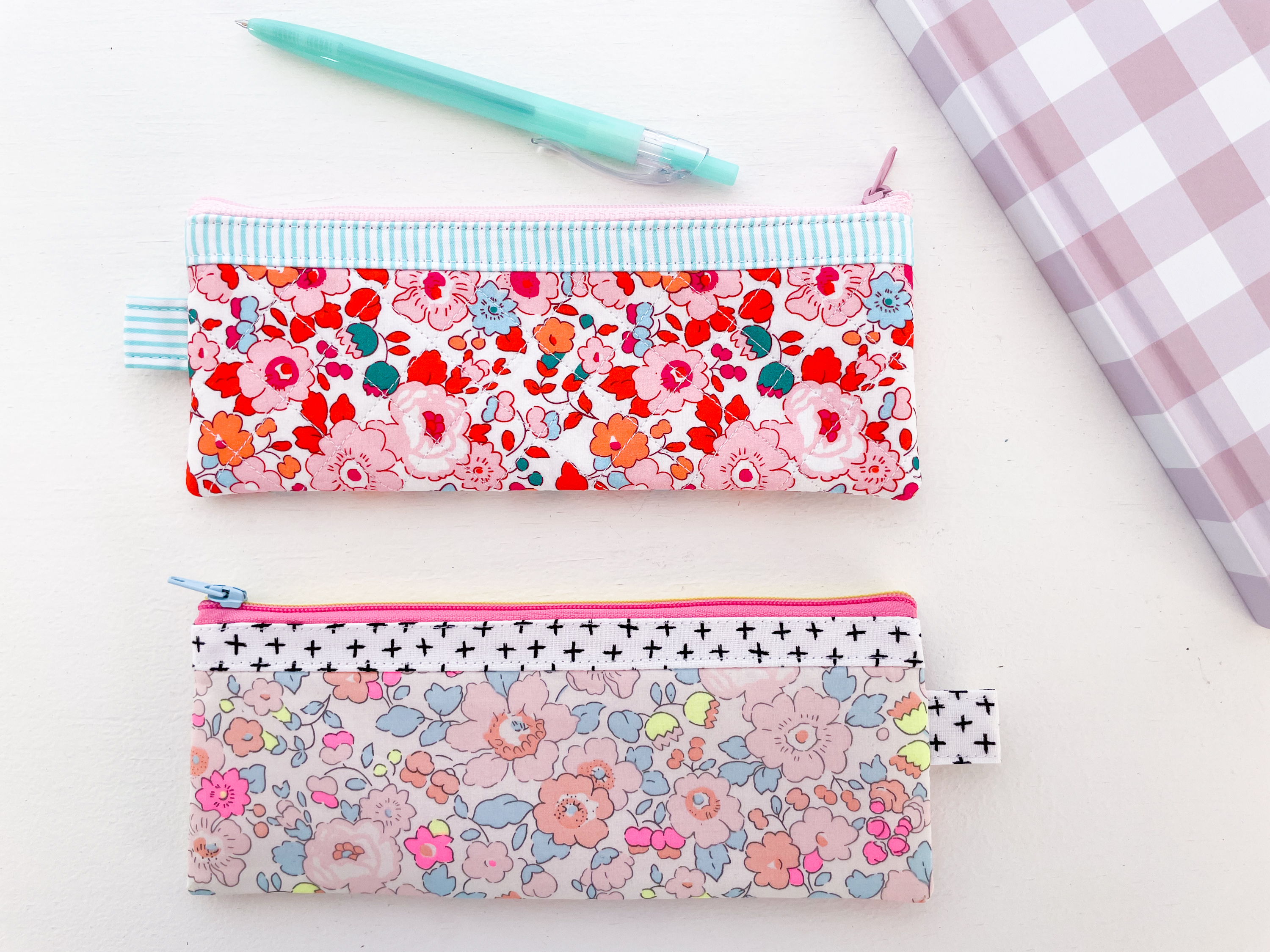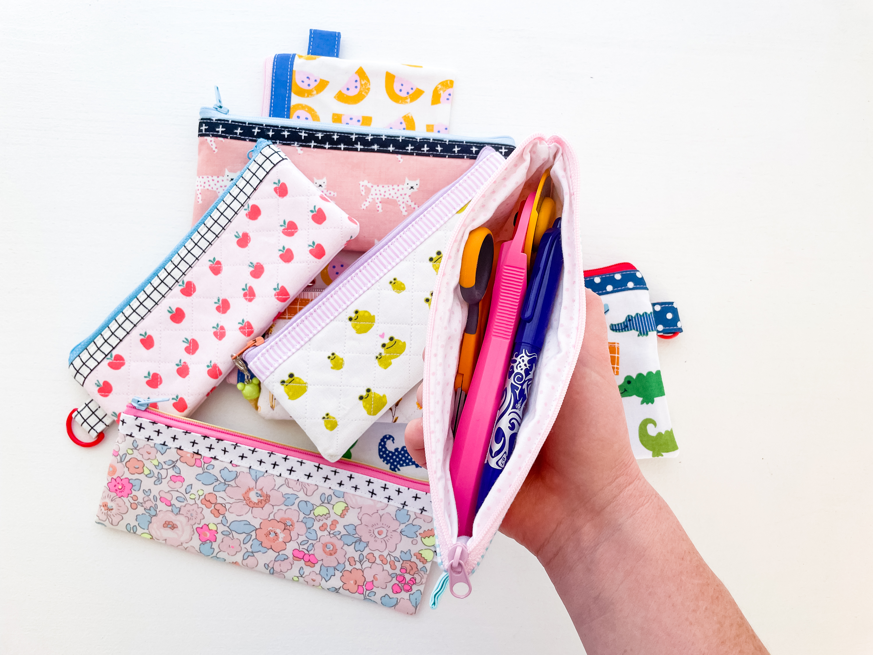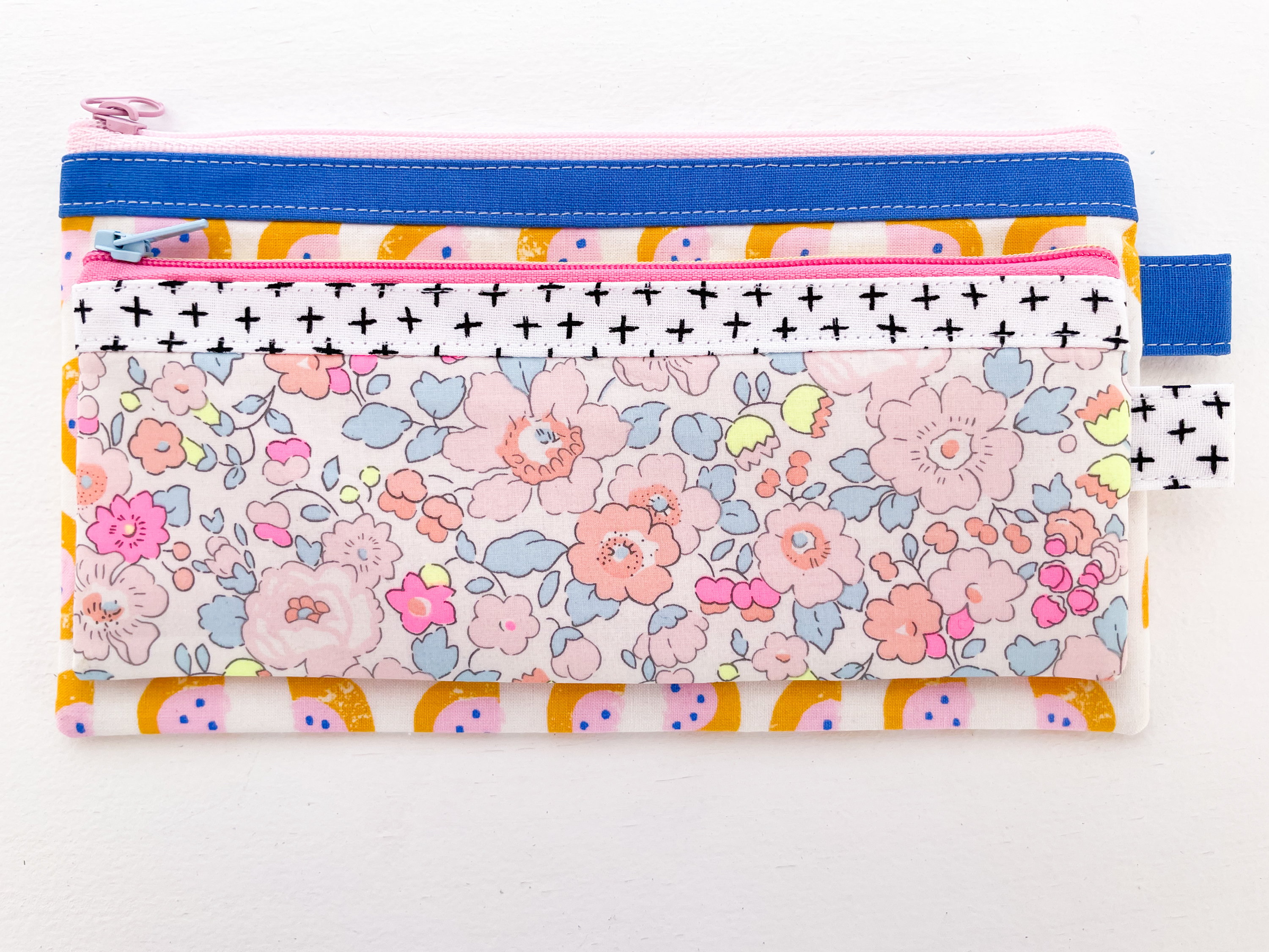 The Pixie Pencil Pouch is a tiny, slim zipper pouch with a contrasting zipper binding and pull tab and sweet squishy quilted texture. Perfect for using up small bits of leftover cotton batting or experimenting with contrasting fabric combinations. It finishes at just 8” x 3”. The smallest I could make it while still remaining functional.