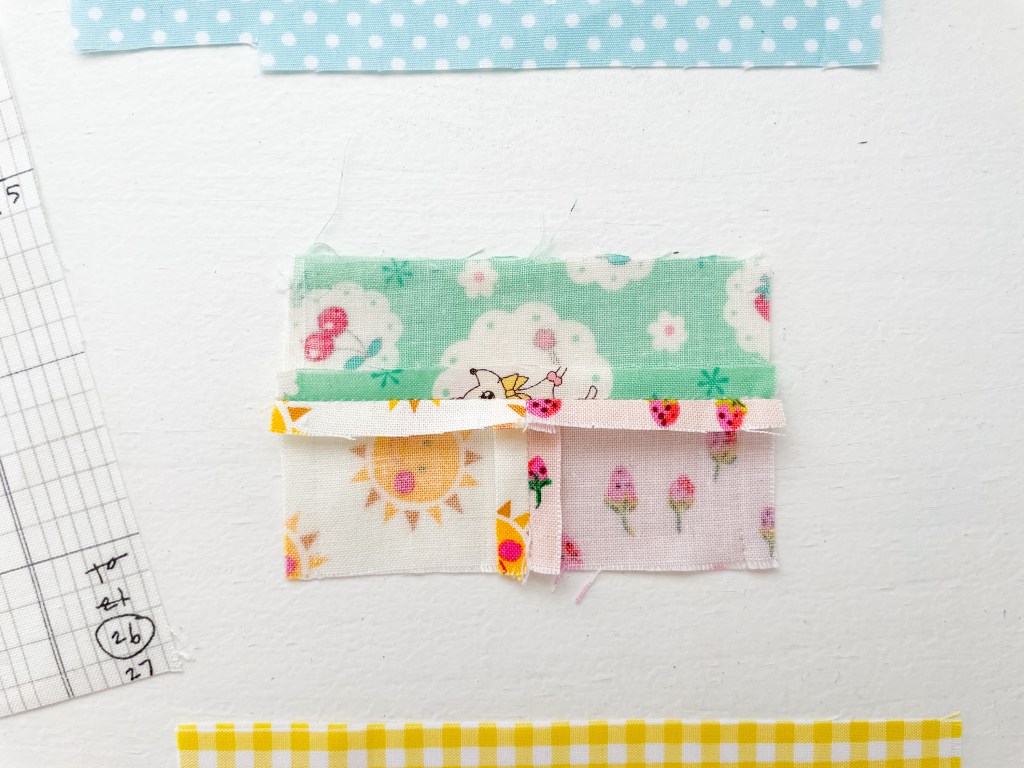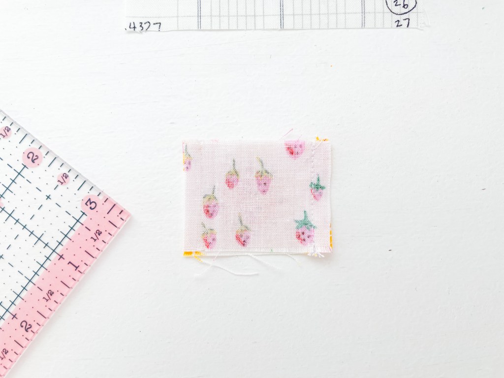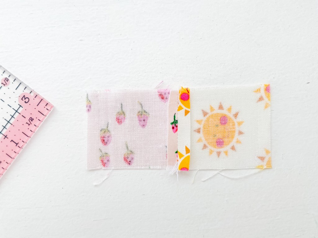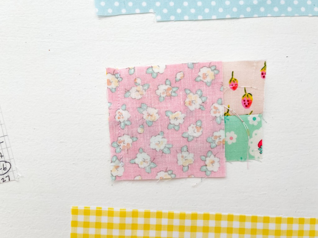 Again, pick your next fabric scrap to join. I’m placing a pink floral on the left of the panel. So, I square up my panel on the left side, creating a straight edge and make sure the pink scrap also has a straight edge where they are going to join.