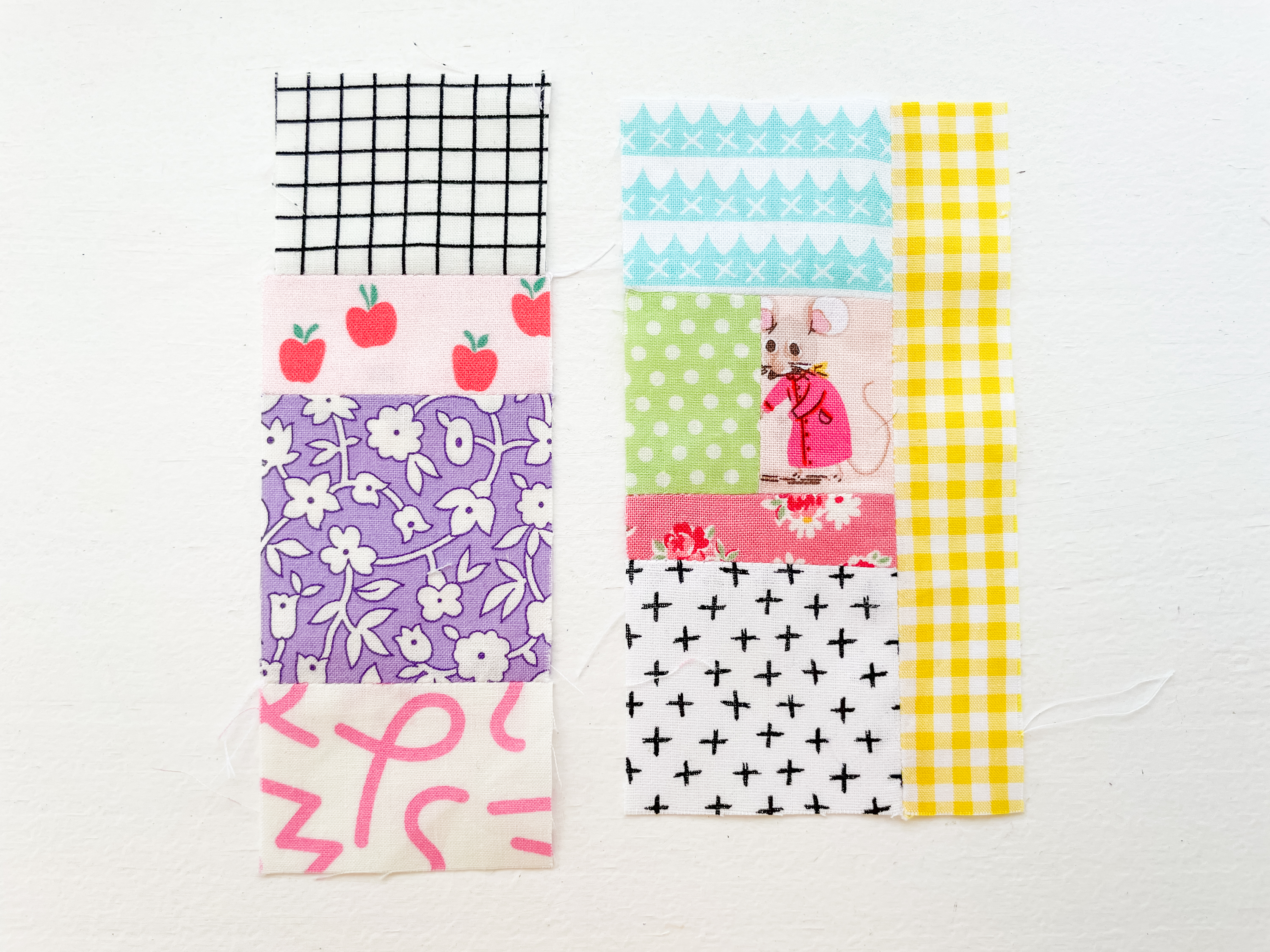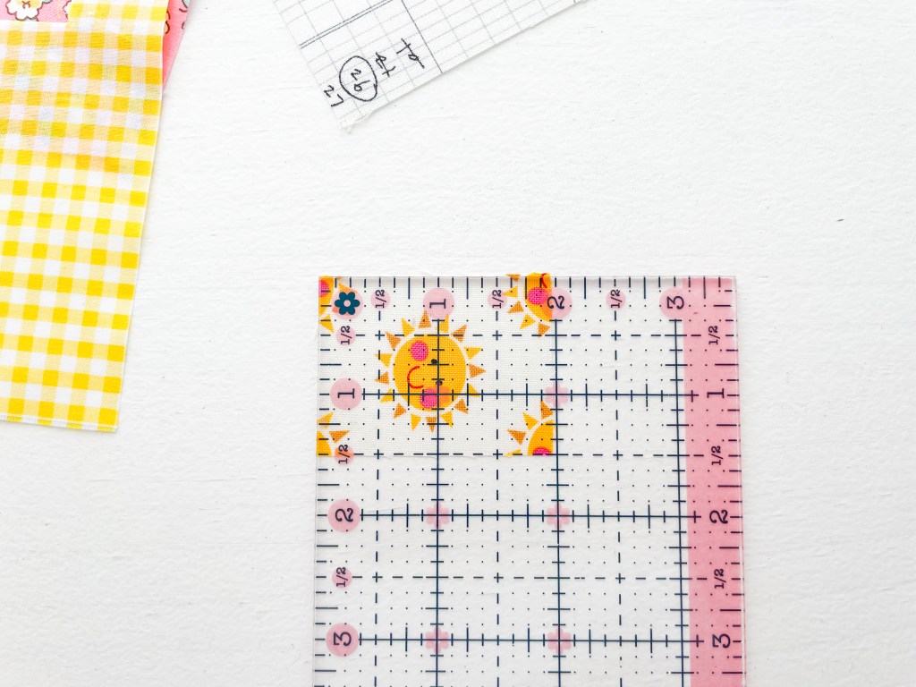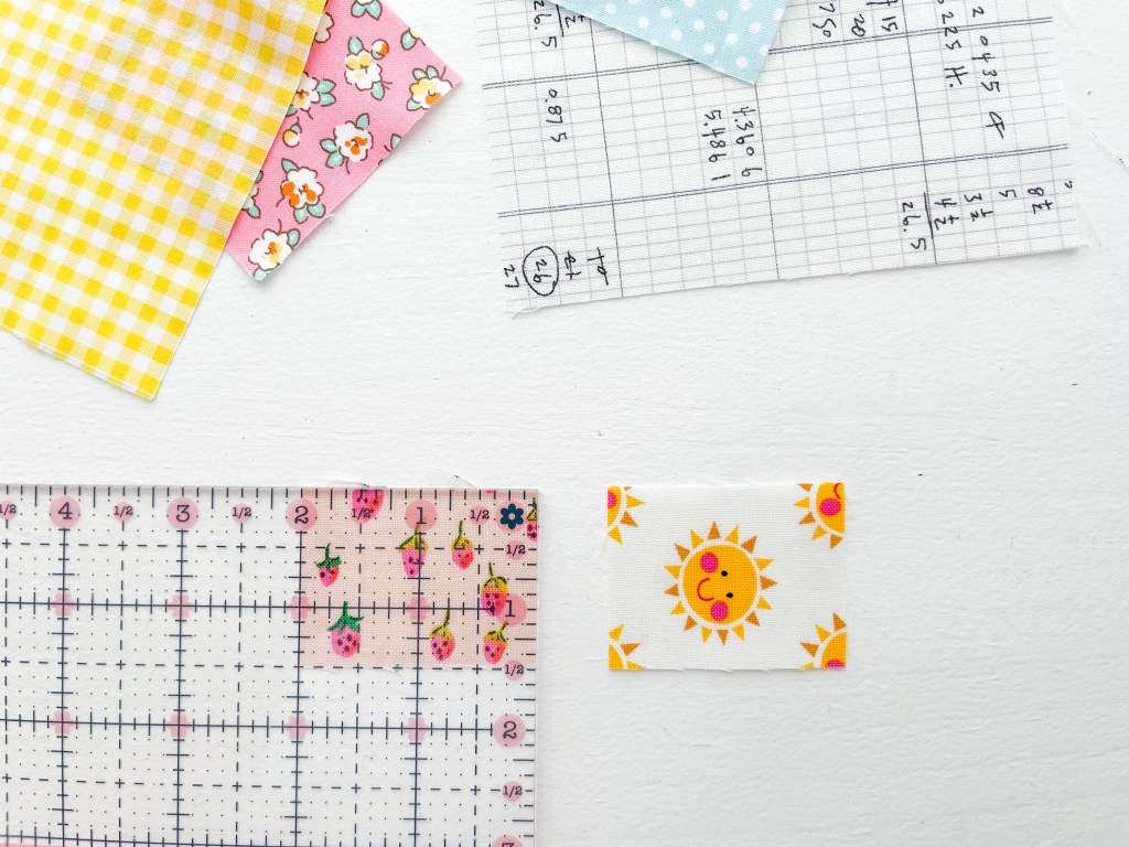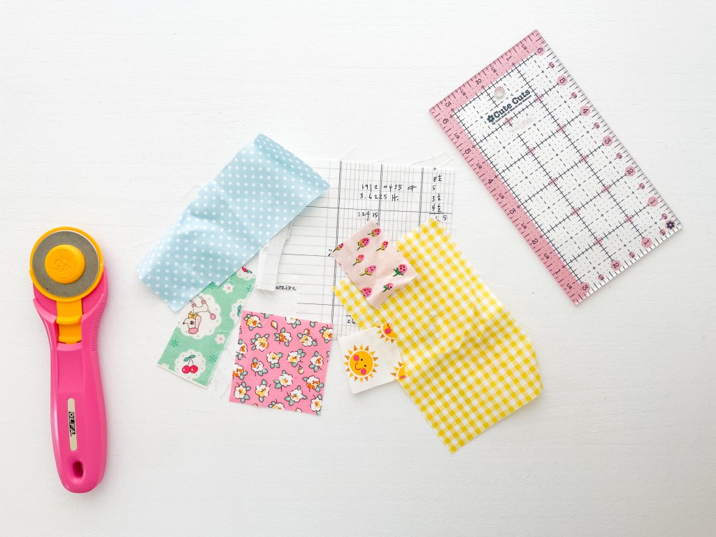 Select the fabric scraps that you wish to use. Remember they can be different sizes and odd shapes. We are going to square them up with a quilting ruler and trim them to suit your needs, as you are going. Give them a good press with a hot iron before beginning. If you are using any fabrics that are lightweight (e.g. liberty lawn) it’s a good idea to starch them as well as this makes the piecing process a little easier.