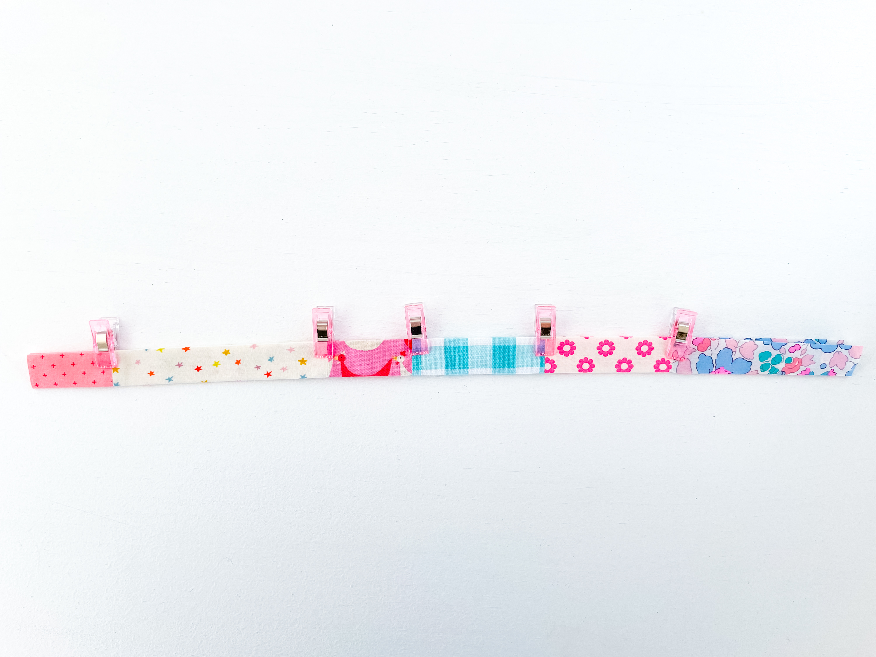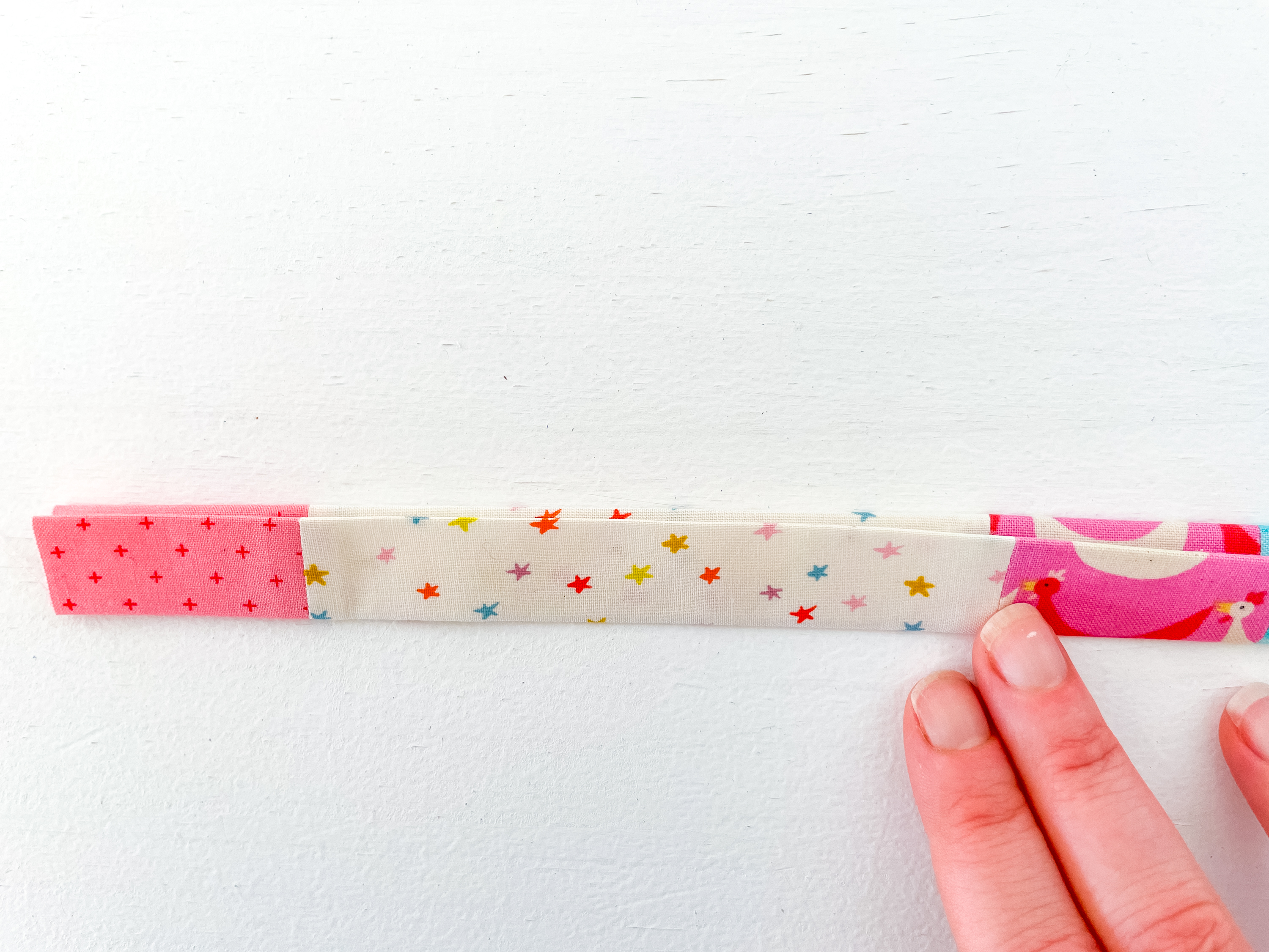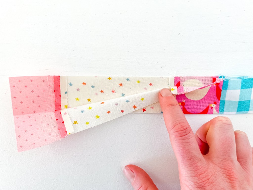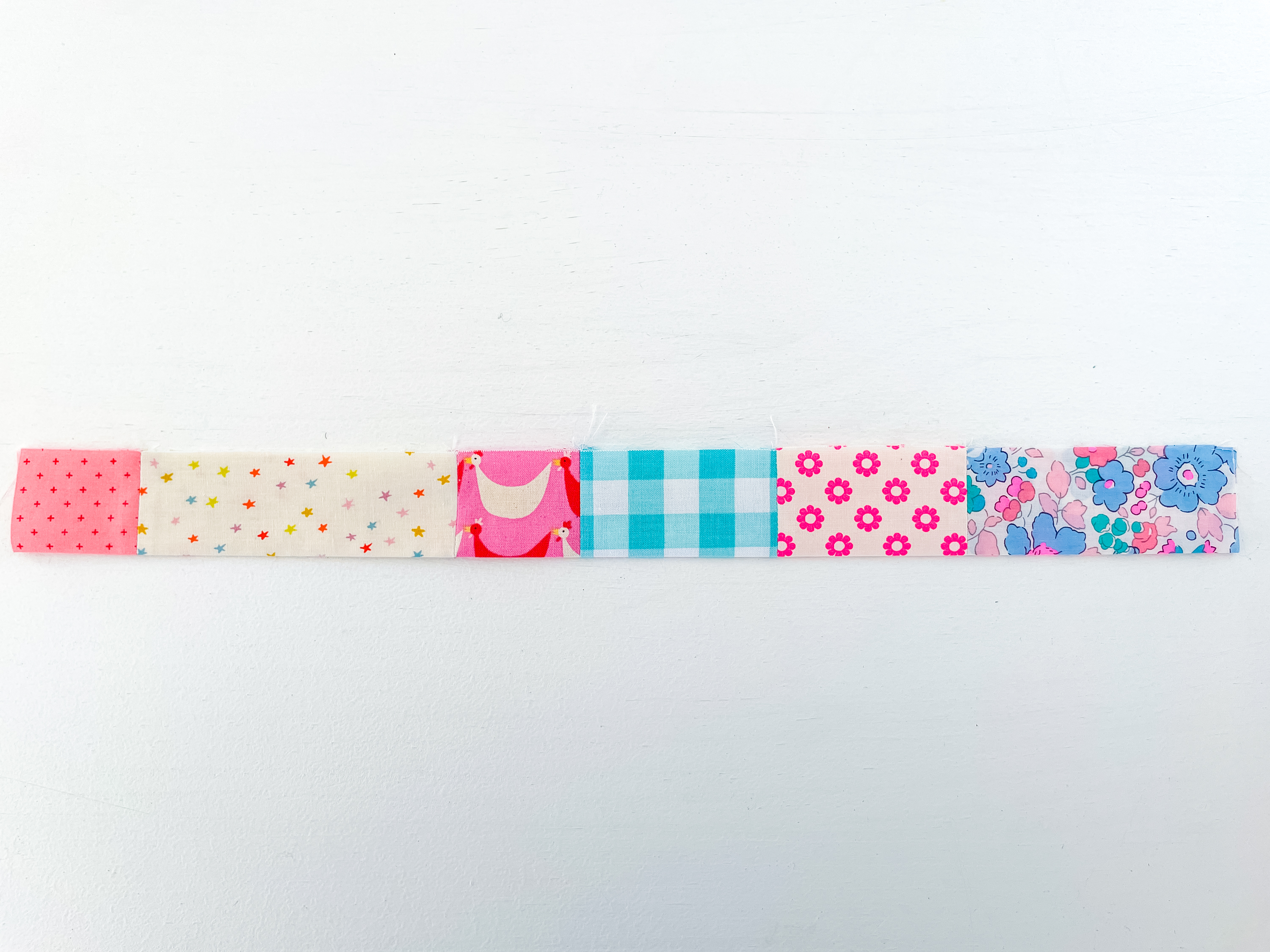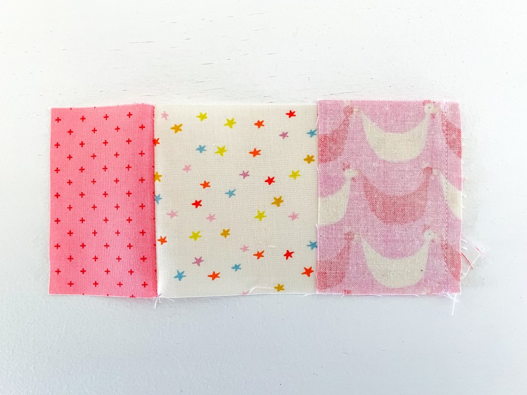 2. Sew the fabric strips together along the 3″ side with a ¼” seam allowance. Remember to secure your stitches at the start and end of the seam.